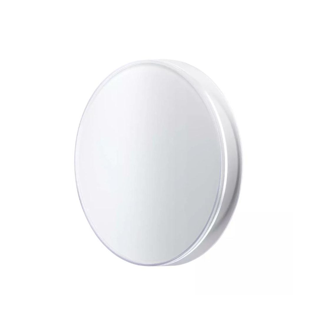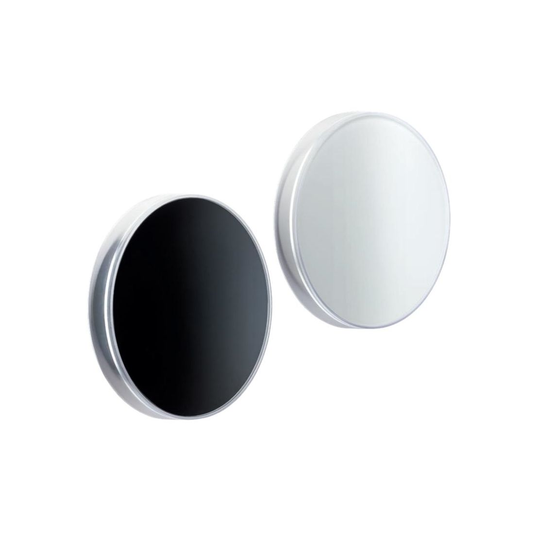 Lampada da parete dalla forma rotonda ideata per ambienti esterni, ad emissione luminosa indiretta, che si presenta con il corpo realizzato in pressofusione di alluminio verniciato a polveri nelle finiture Bianco opaco o Nero opaco, con parte frontale decorativa in vetro temperato serigrafiato (Bianco o Nero, in abbinamento alla finitura scelta), incorniciato da un bordo in policarbonato trasparente per un dettaglio di design. Il diffusore interno, realizzato in policarbonato con finitura satinata, è studiato per ottimizzare l'erogazione luminosa.