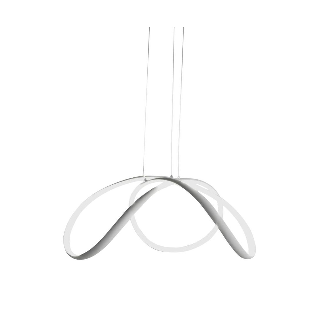 Sospensione dallo stile moderno, con un design fresco e armonioso, che si presenta con una struttura realizzata in metallo di colore Bianco e con il diffusore in silicone opalino bianco attorcigliato.