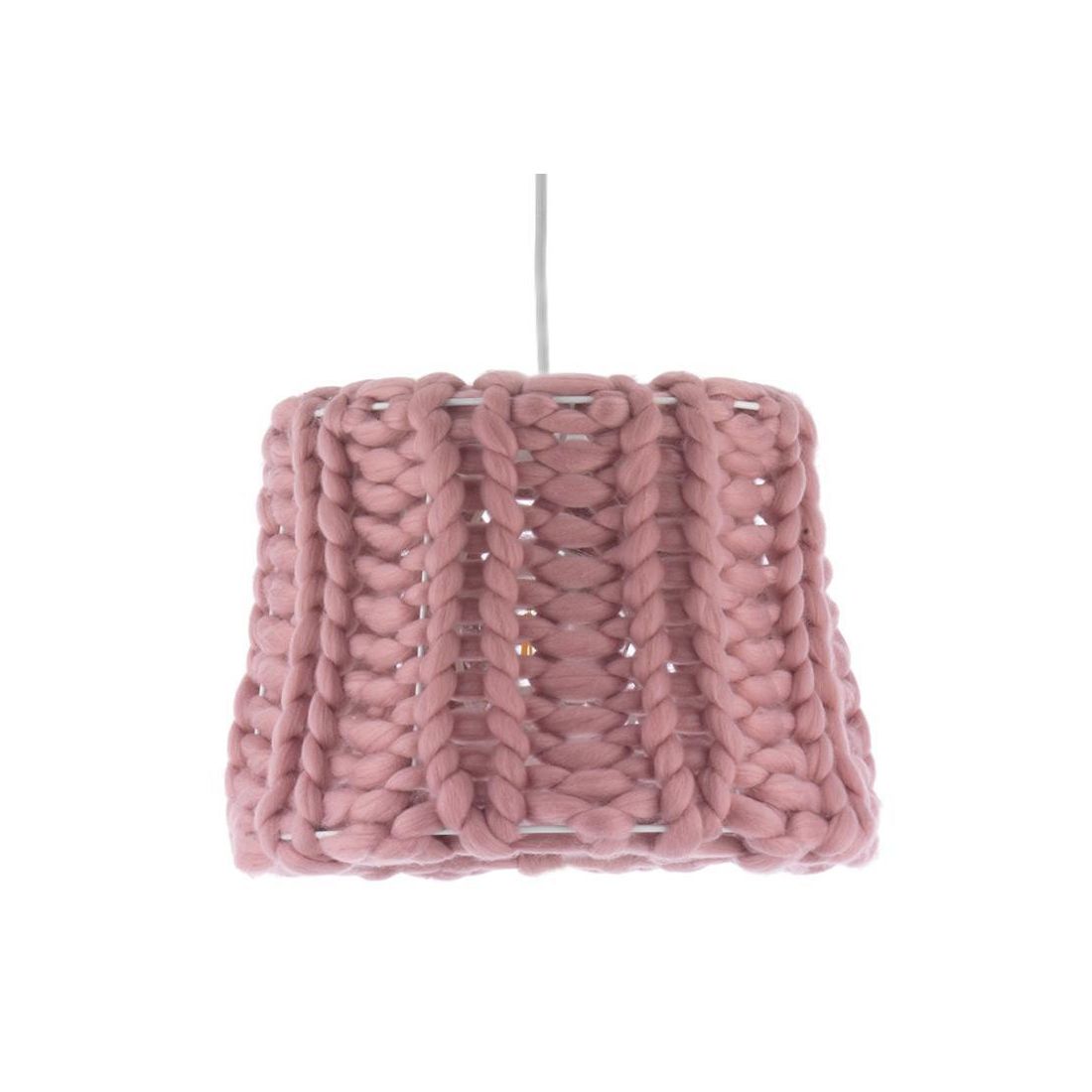 Sospensione singola con un design moderno che si presenta con un rosone a soffitto e con la struttura realizzati entrambi in metallo verniciato nel colore bianco e con il paralume, aperto sia sopra che sotto, realizzato in lana nel colore Rosa antico che trasmette l'idea di calore e del sentirsi a casa.