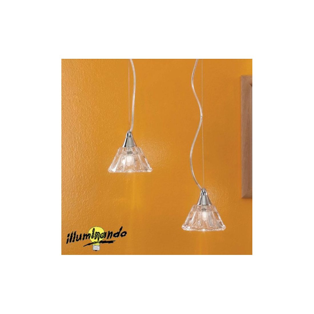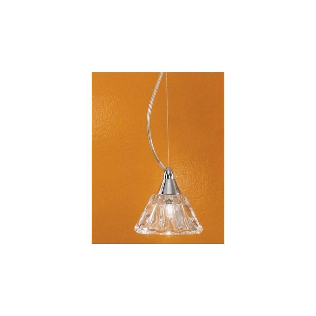 Sospensione singola realizzata in metallo cromato con diffusore in vetro pressato trasparente studiata per ambienti interni, dal design moderno ma semplice, che si adatta ad ogni ambiente della casa, ideale sopra a tavoli o penisole della cucina o del soggiorno in abbinamento, eventualmente, ad altre sospensioni per creare sulle superfici dei giochi di luce particolari.