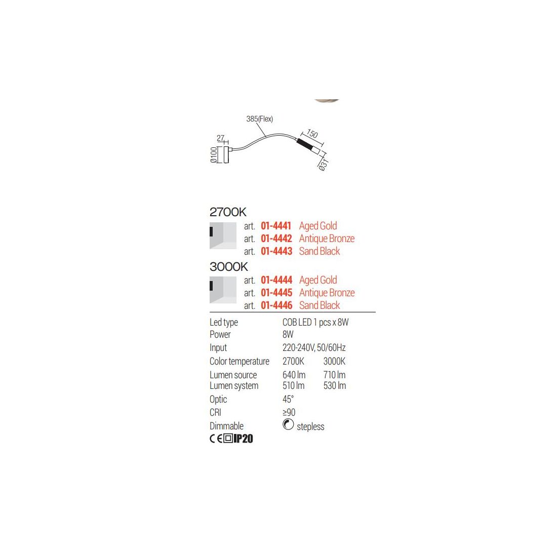 Sorgente luminosa: Led integrato da 8w - luce 2700k:lm 640 - luce 3000k:lm 710