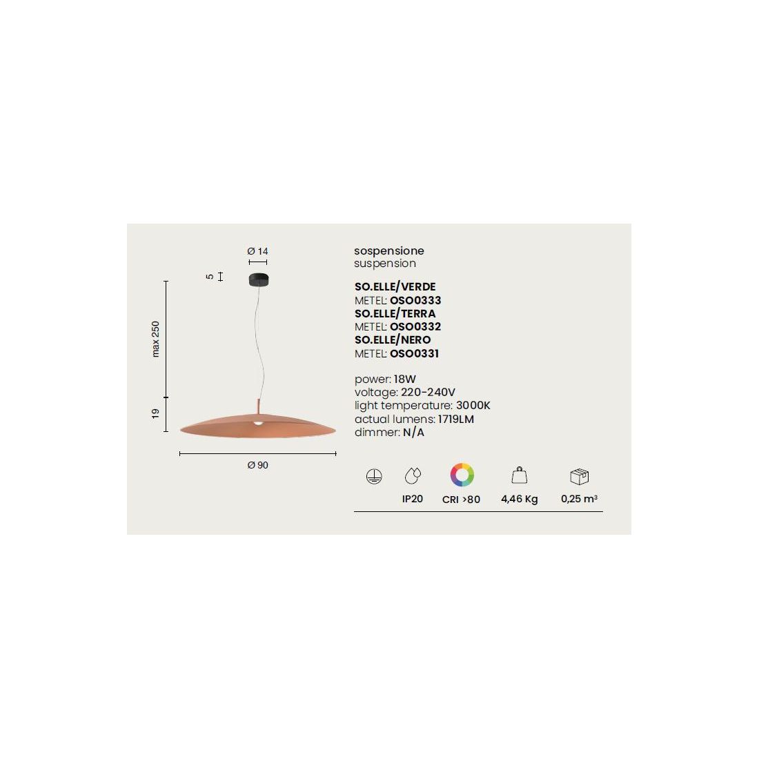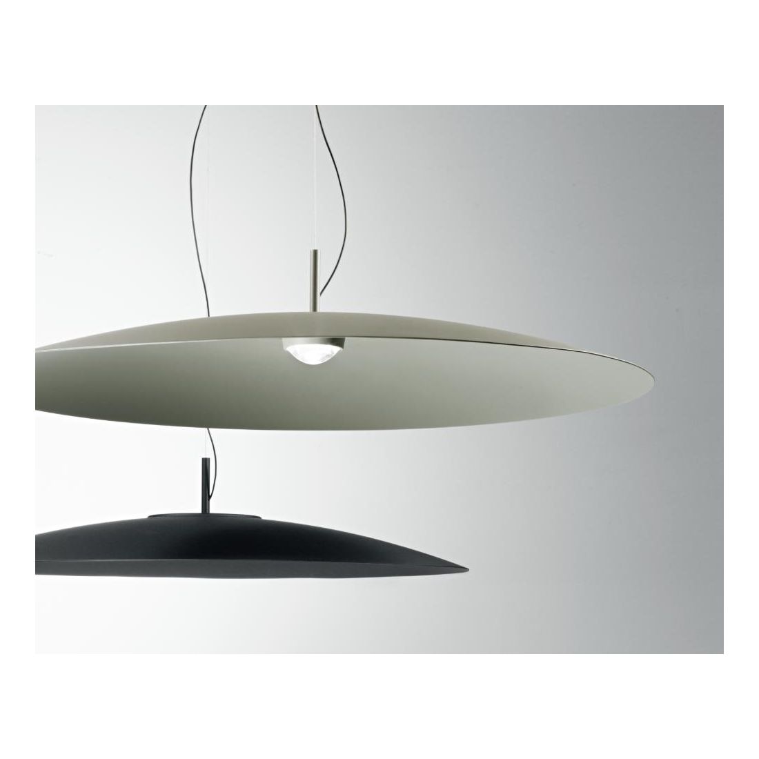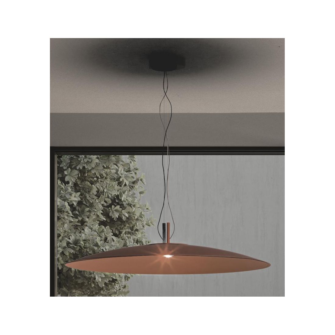 Lampadario a sospensione con diffusore a disco, in stile moderno, realizzato interamente in alluminio verniciato nei colori Terra, Verde oppure Nero (a vostra scelta); con un diametro di 90 cm questo elemento sospeso si impone con una presenza scenica importante diventando protagonista dello spazio senza rinunciare all’equilibrio estetico.