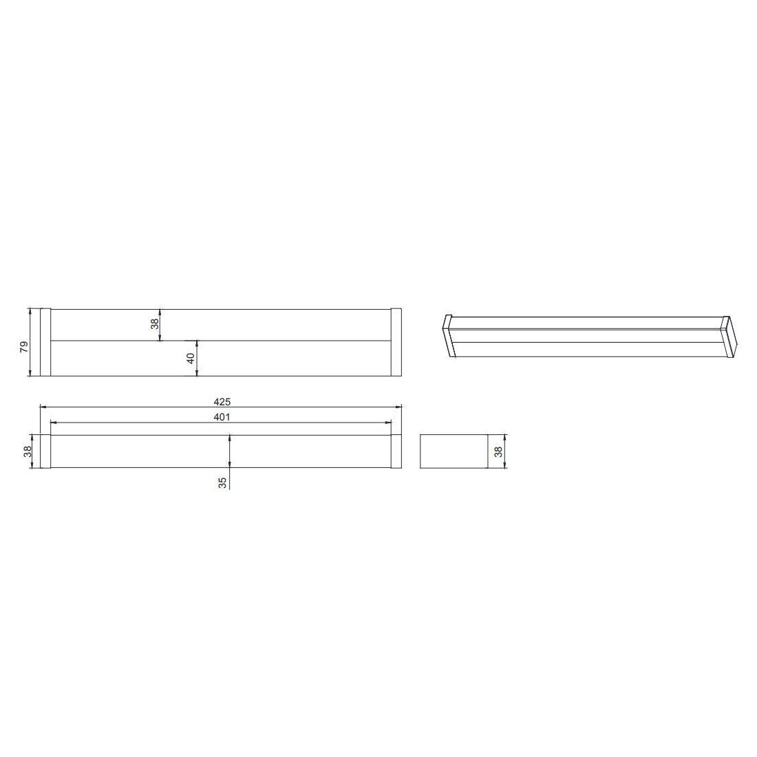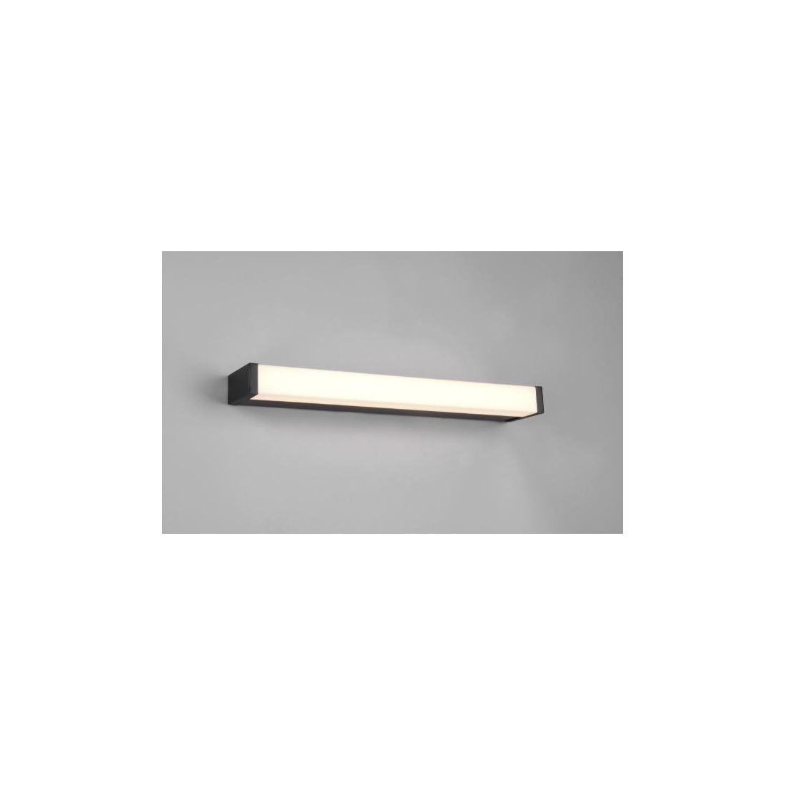Lampada da specchio, dal design moderno, con una larghezza di cm 42,5, con una struttura realizzata in metallo con finitura Nera con il diffusore in acrilico bianco che è dotata di sorgente luminosa integrata con Led da 6w, resa luminosa 700 lumen, con luce bianca calda 3000k.