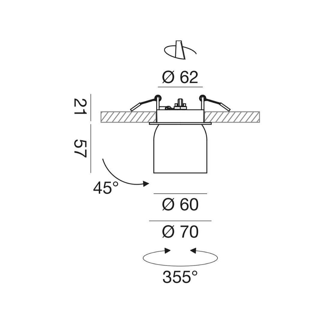 Questo faretto da incasso ridefinisce il concetto di flessibilità luminosa infatti, grazie a un sofisticato sistema di snodo meccanico, il proiettore permette un'inclinazione di 45° e una rotazione sull'asse verticale di 355° offrendo la libertà di modellare il fascio luminoso in base alle specifiche esigenze architettoniche o d'arredo.
