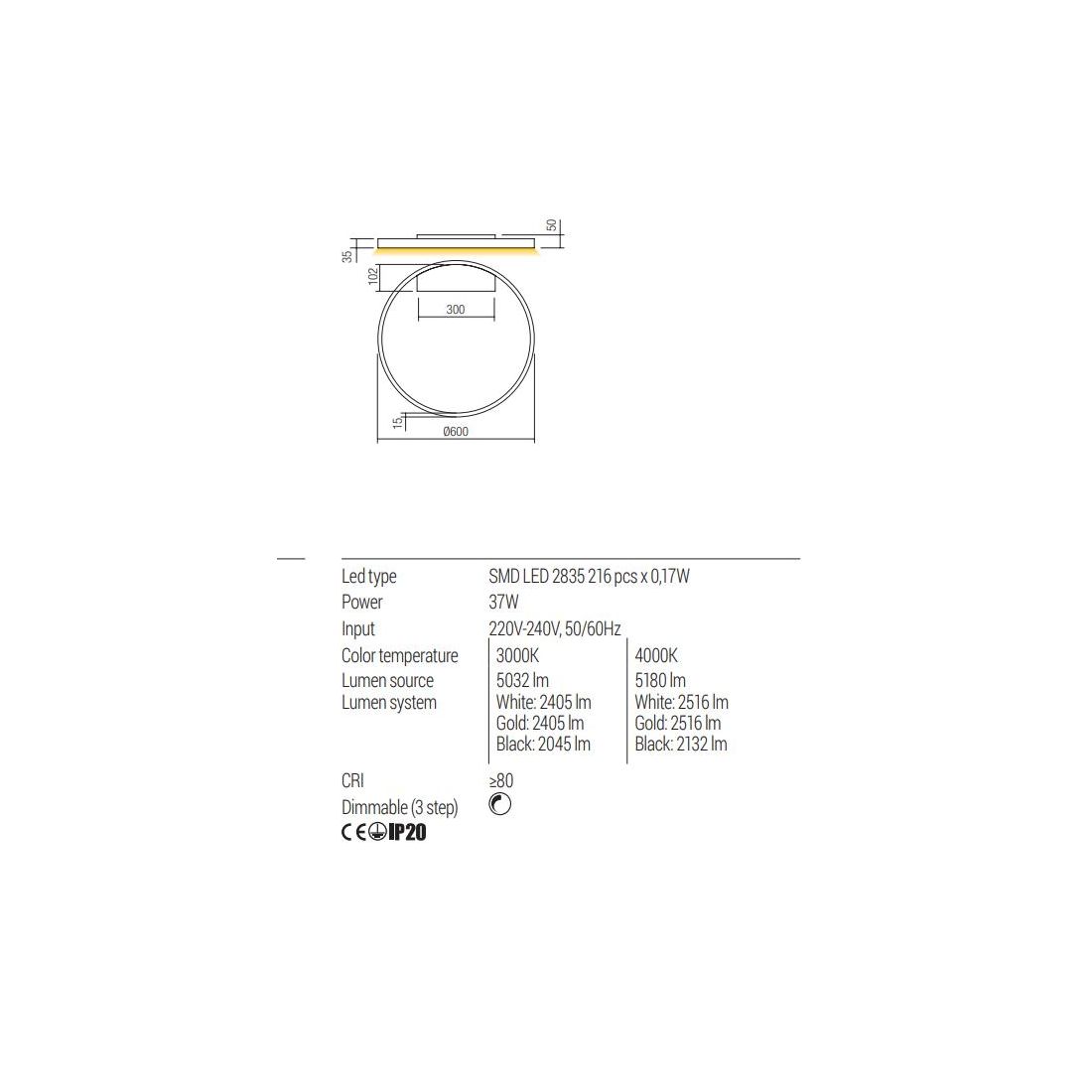 FEBE APPLIQUE ROTONDA D60 CM LED 37W LUCE INDIRETTA 3000K-4000K DIMMERABILE ALLUMINIO...