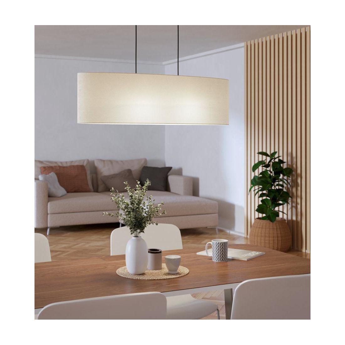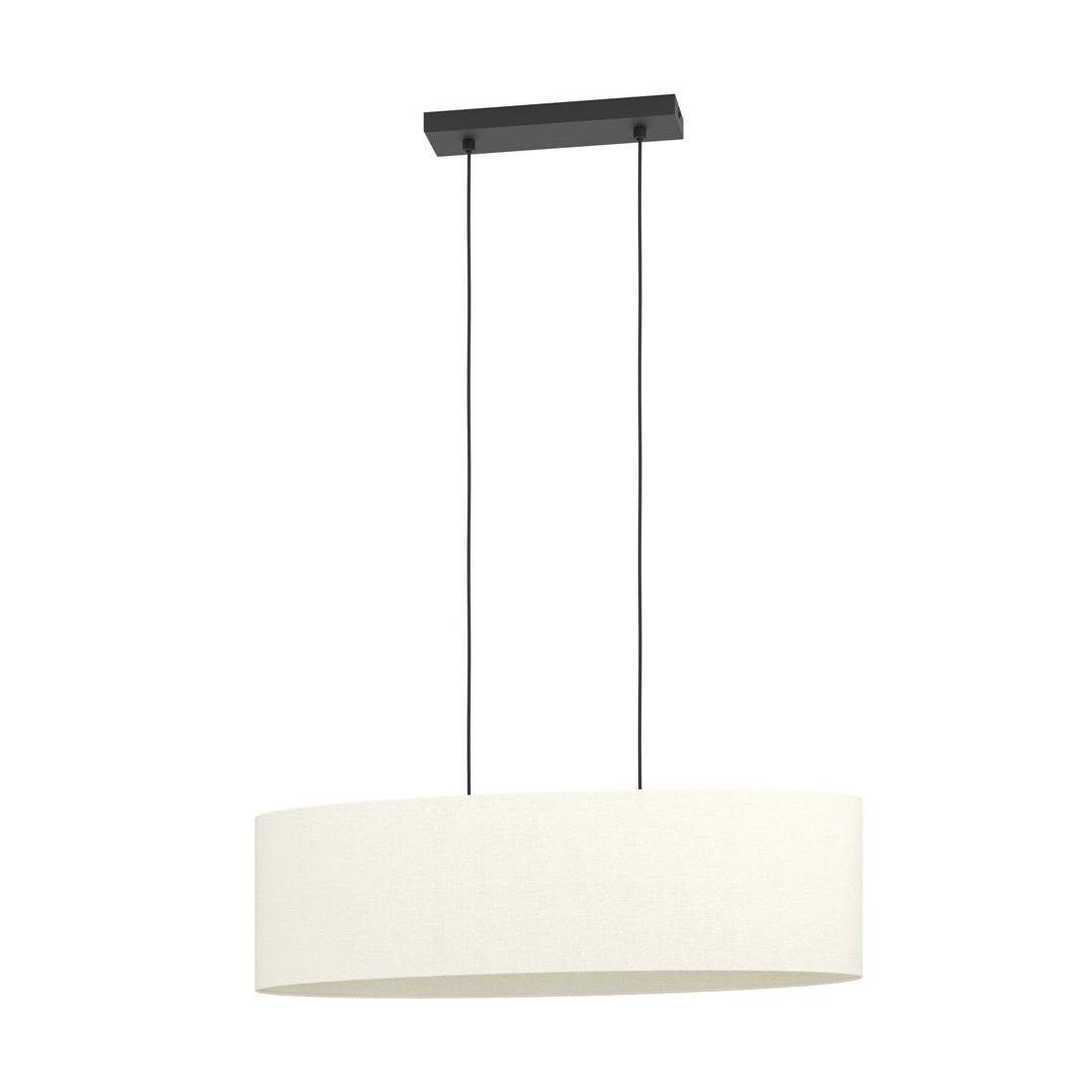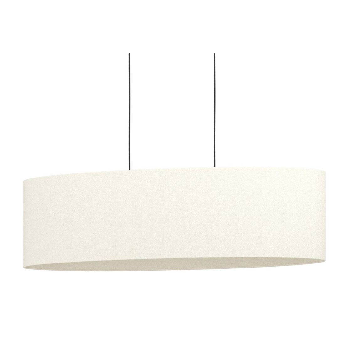 Lampadario a sospensione, con una forma ovale allungata, dal design moderno che viene realizzato con il paralume in tessuto di colore Bianco abbinato a una struttura in metallo nero. Il suo stile essenziale e l'ispirazione naturale lo rendono un elemento d'arredo estremamente versatile capace di inserirsi con armonia e personalità in contesti abitativi sia moderni che tradizionali rivisitati.