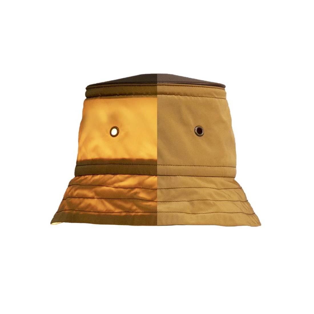 L’accessorio in tessuto usato per il paralume e le cuciture riprendono gli elementi tipici di questi cappelli, con gli occhielli in ottone per la condensa. Il cappello si stringe intorno al bordo della struttura in alluminio per poi essere fissato con una sicura.