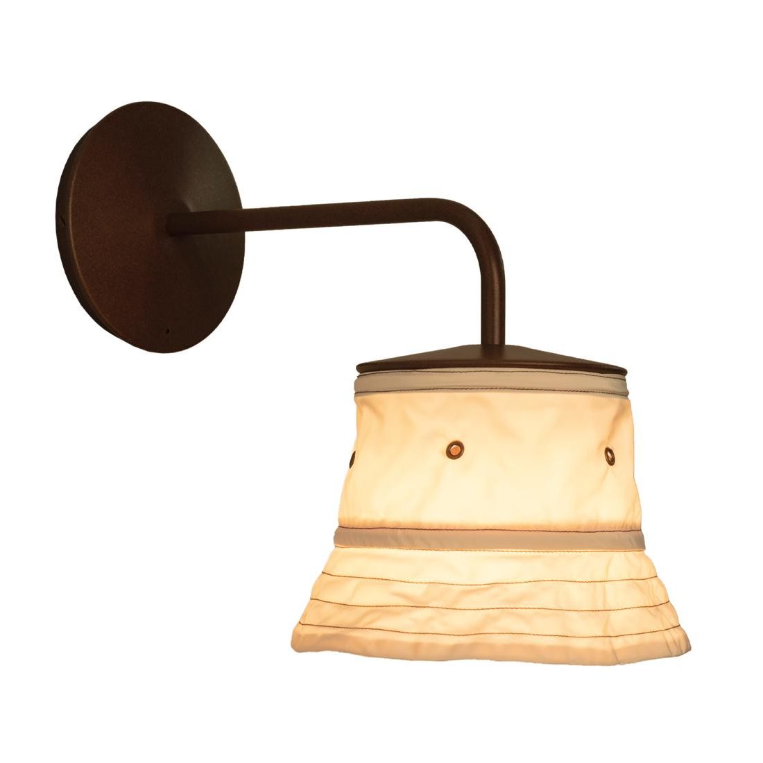 Lampada da parete realizzata artigianalmente in Italia che si presenta con la struttura in alluminio e ottone verniciata nella finitura corten e con il paralume, originale e simpatico, a forma di cappello realizzato in poliestere che emette la luce rivolta verso il basso.