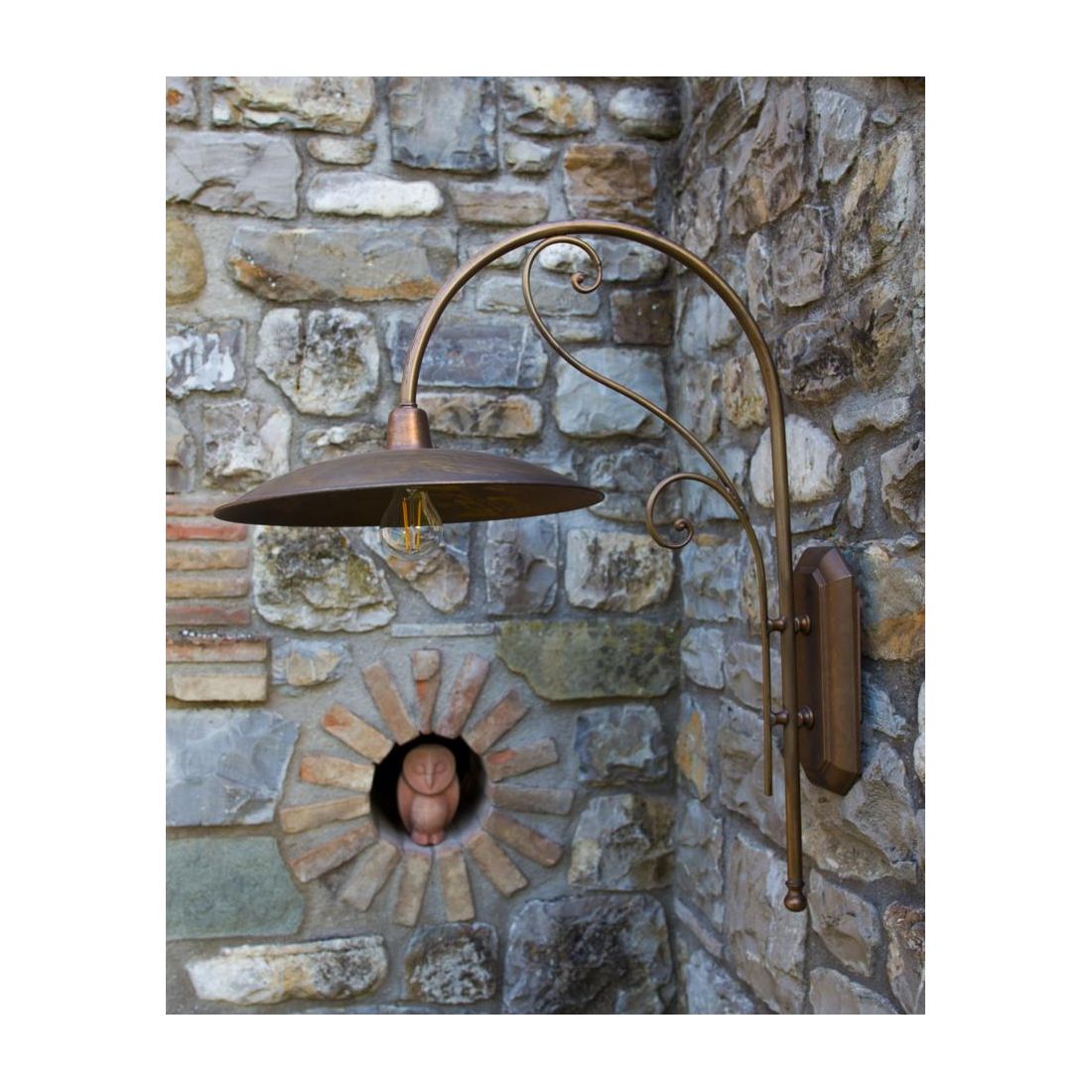 Lampada da parete ideata per ambienti esterni caratterizzato da un braccio curvo con ricciolo, dallo stile classico, che si presenta con una struttura realizzata interamente in Ottone, prodotto Made in Italy, disponibile in tre diverse finiture colore, a vostra scelta: Bronzo Aria - Bronzo Vintage, con il piatto del diametro di cm 30 oppure di cm 37, a vostra scelta in fase d'ordine,