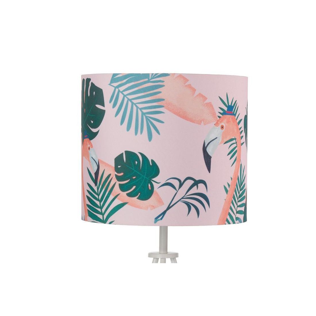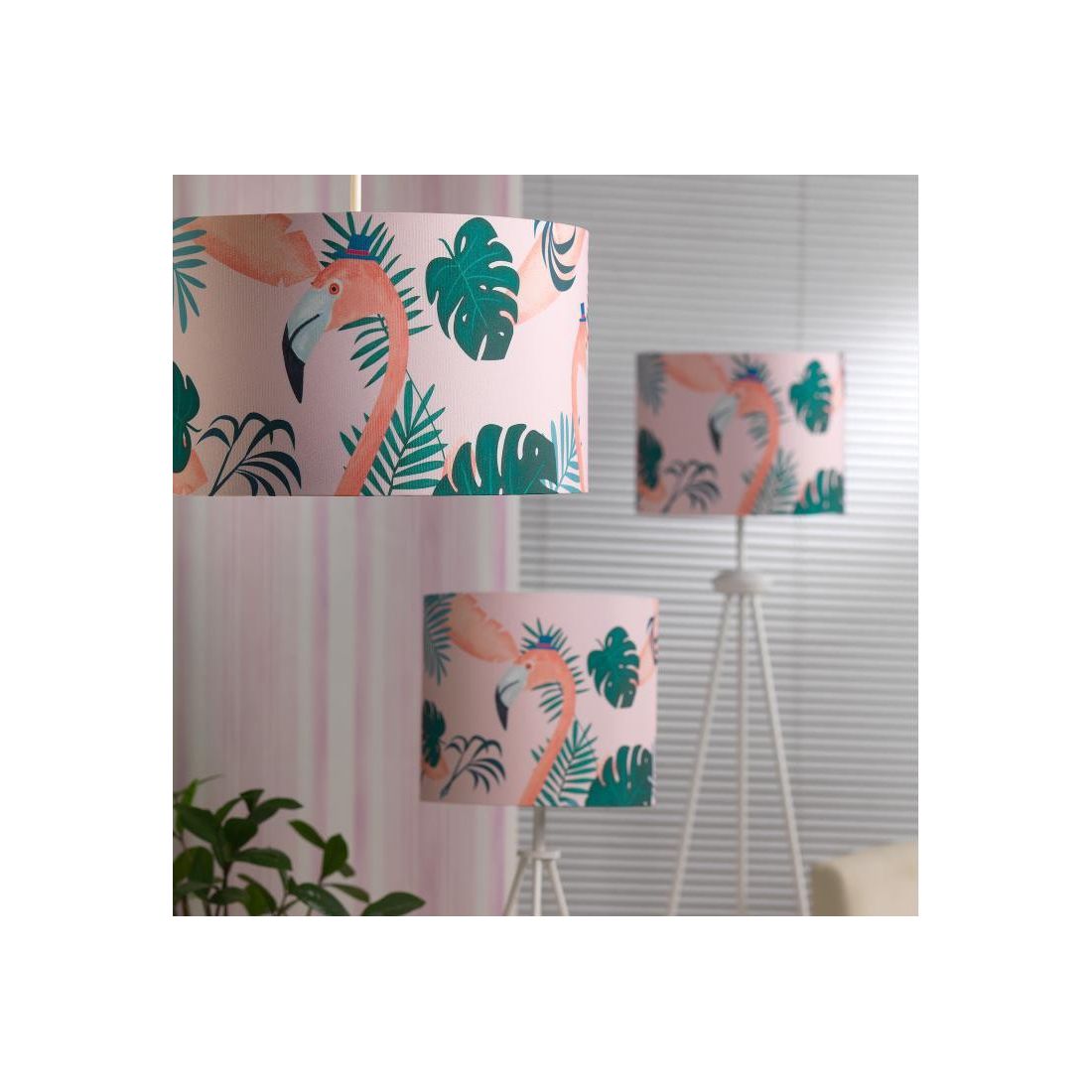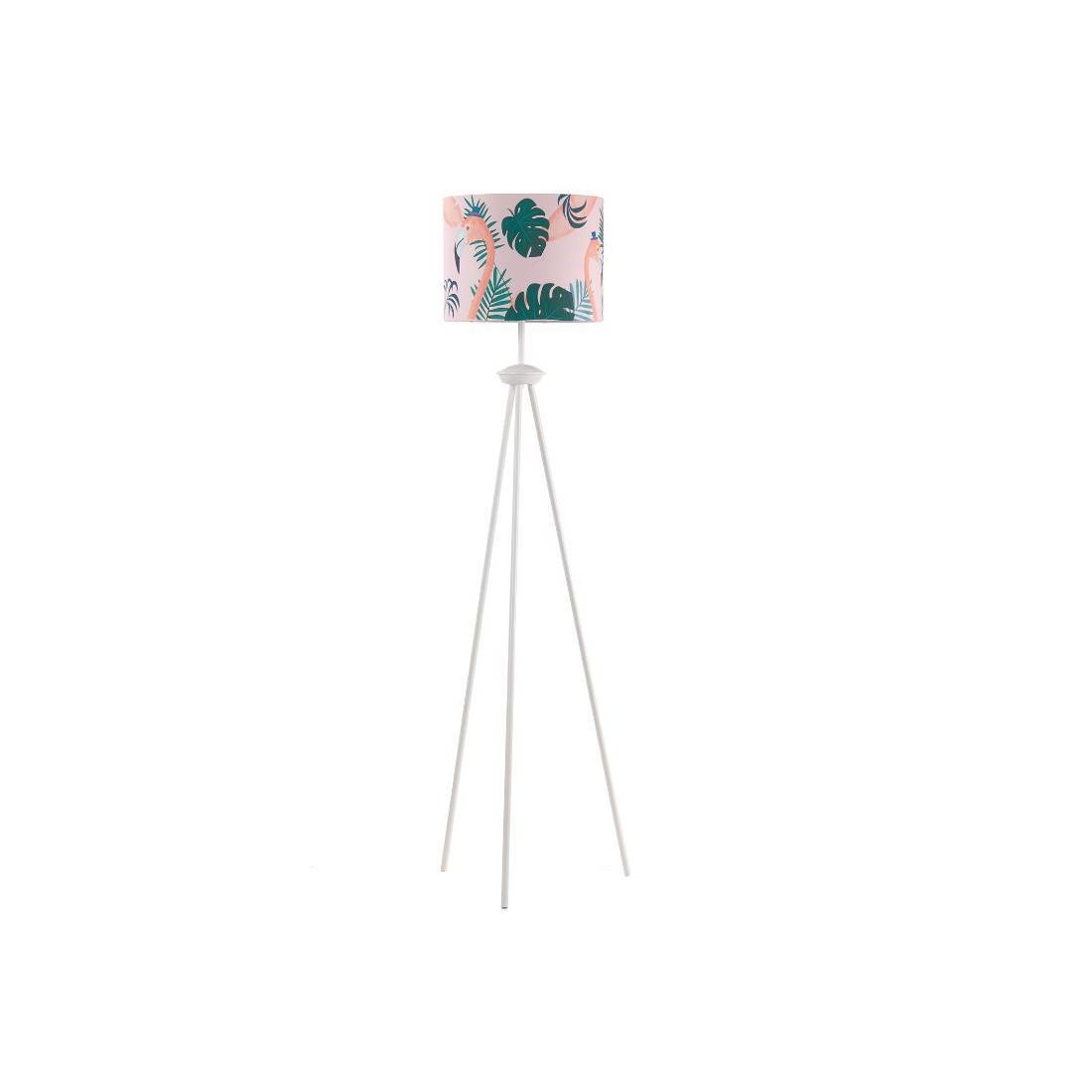 Lampada da terra con un design moderno che si presenta con una base treppiedi verniciata nel colore bianco e con un paralume cilindrico, aperto sia sopra che sotto, realizzato in tessuto colore Rosa con una decorazione a foglie esotiche verdi e simpatici fenicotteri rosa acceso.