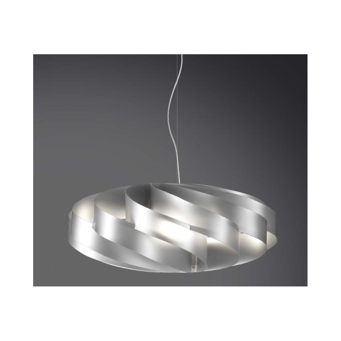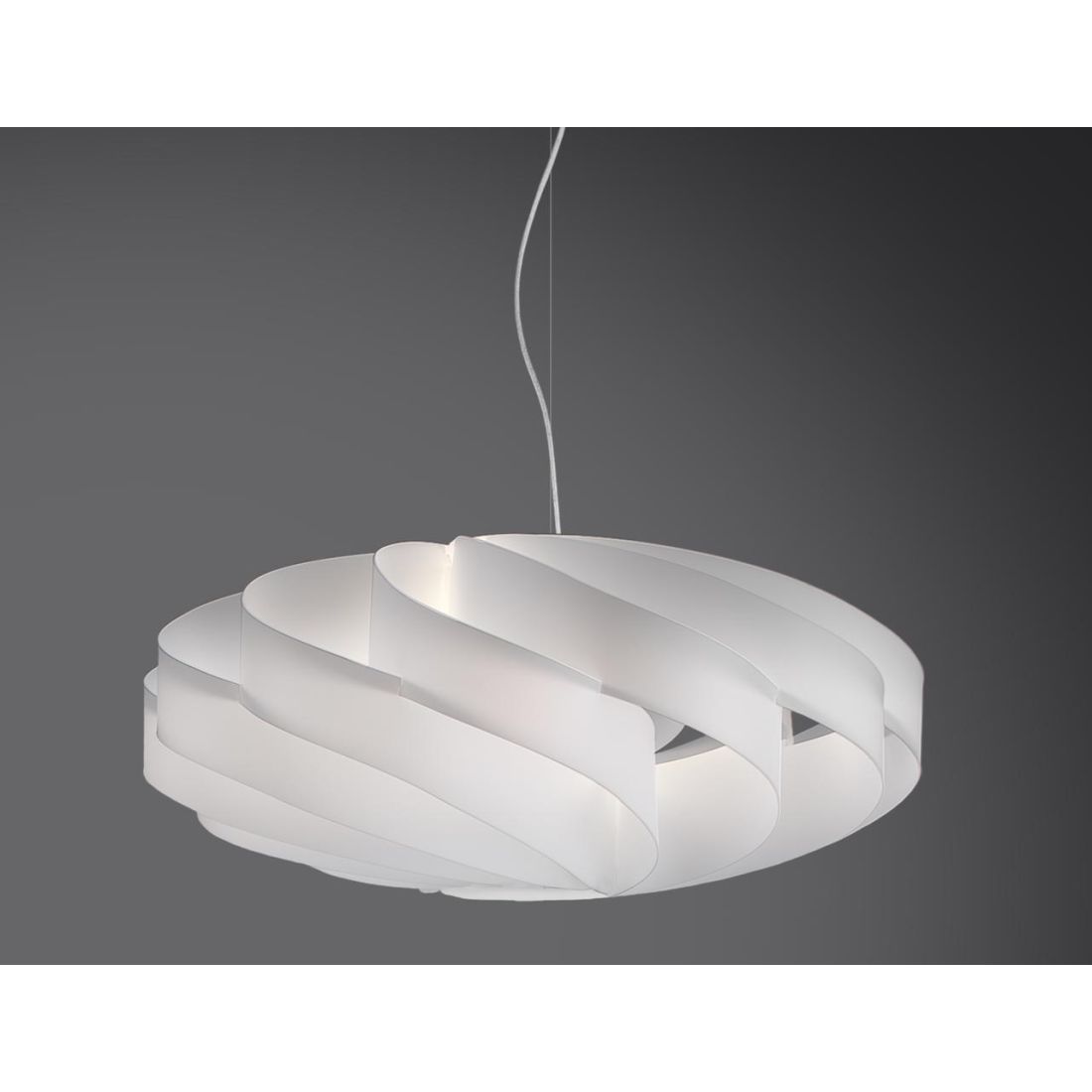 Sospensione di grande dimensioni, con diametro di cm 70, della collezione FLAT della Linea Zero, costruita in Polilux, dal design moderno, adatta per un soggiorno, salotto, cucina, ingresso, ufficio oppure camera da letto, con le sue linee morbide ed avvolgenti che creano una briosa nuvola; un solido scomposto ma regolare, delicato e distinto.