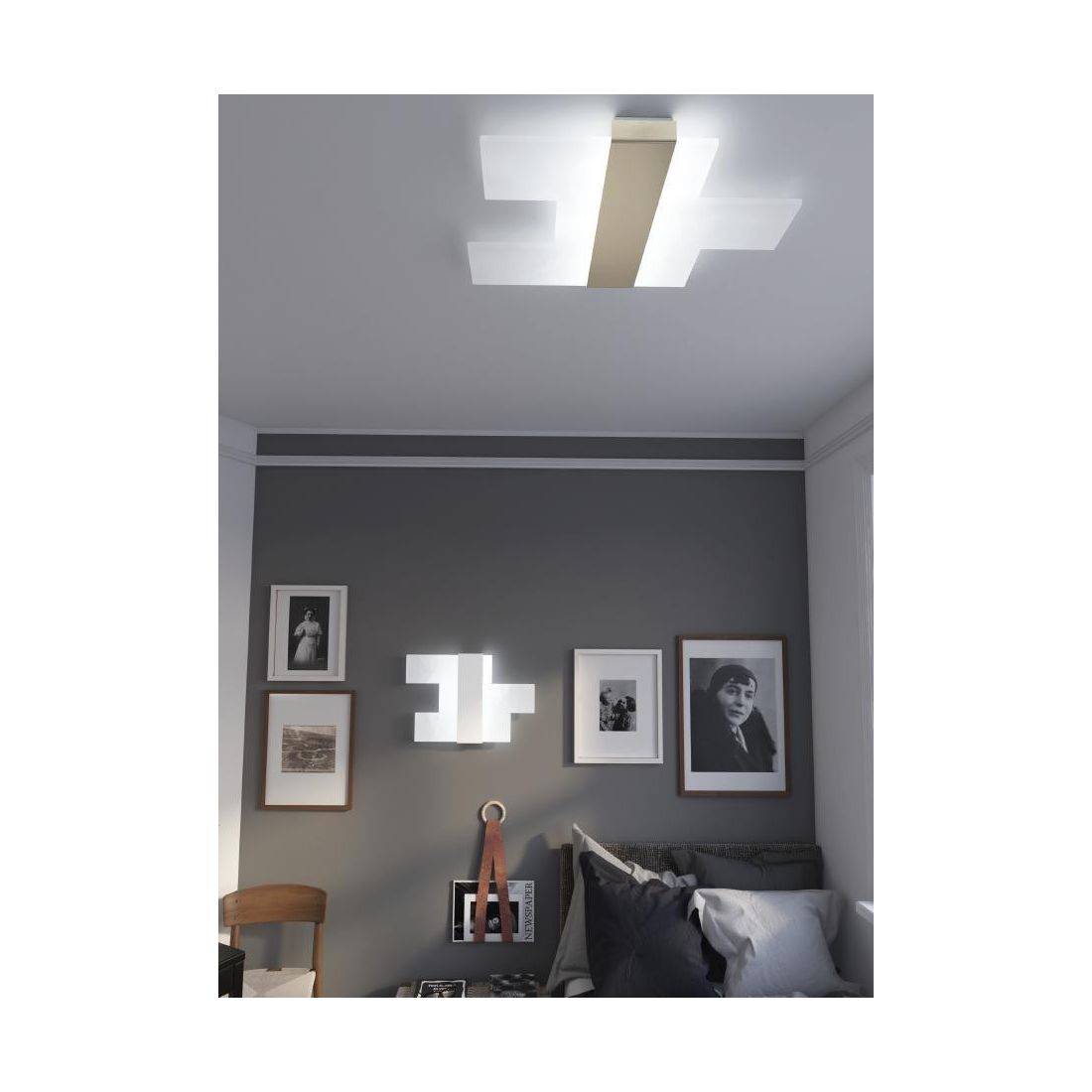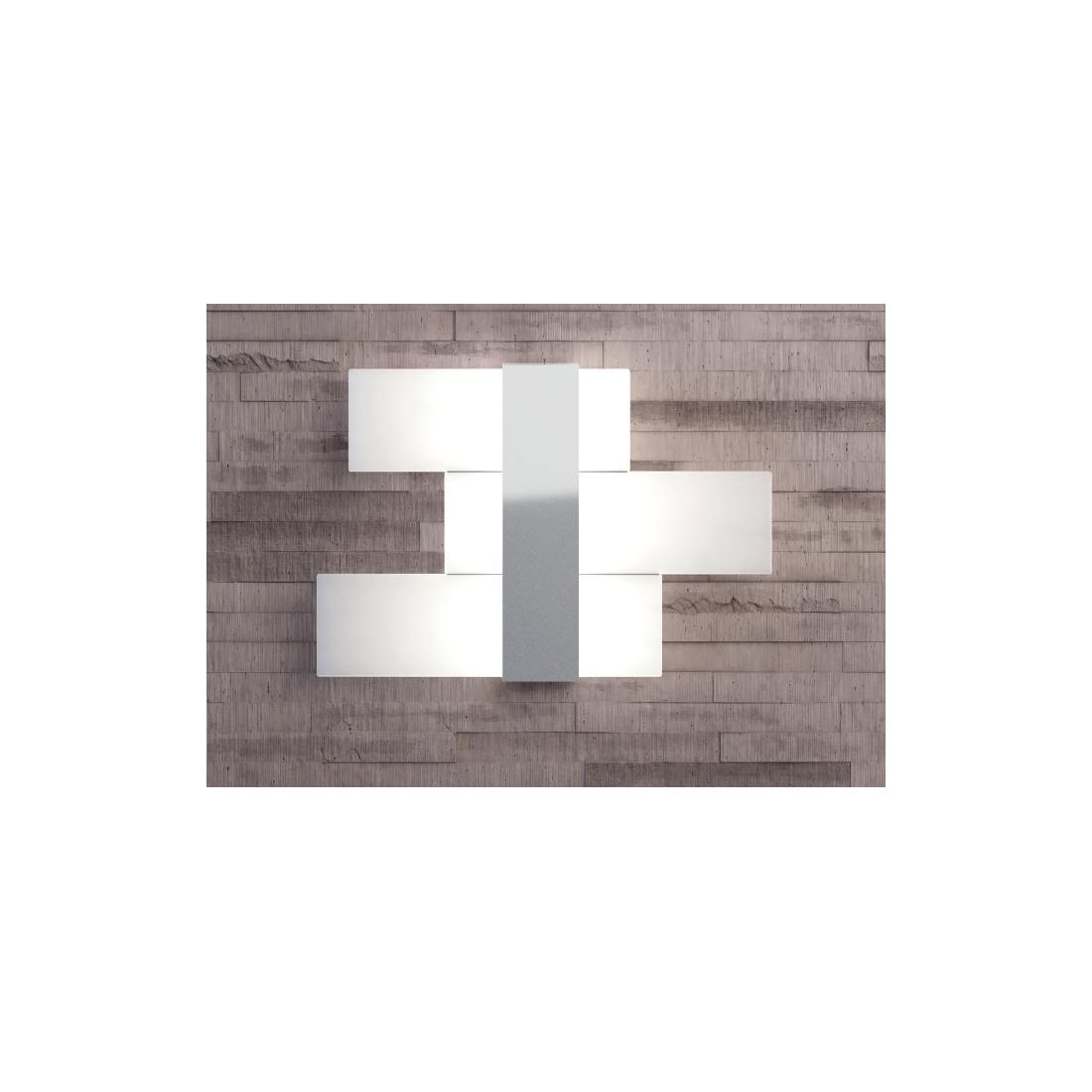 Lampada dalle forme squadrate sia della struttura ma anche dei diffusori che sono prodotti in acrilico disposti in maniera tale da creare un incrocio moderno e stilizzato; il flusso luminoso proiettato dai Led integrati è rivolto verso la parete emanando una luce morbida ma nello stesso tempo diffusa sulla parete.