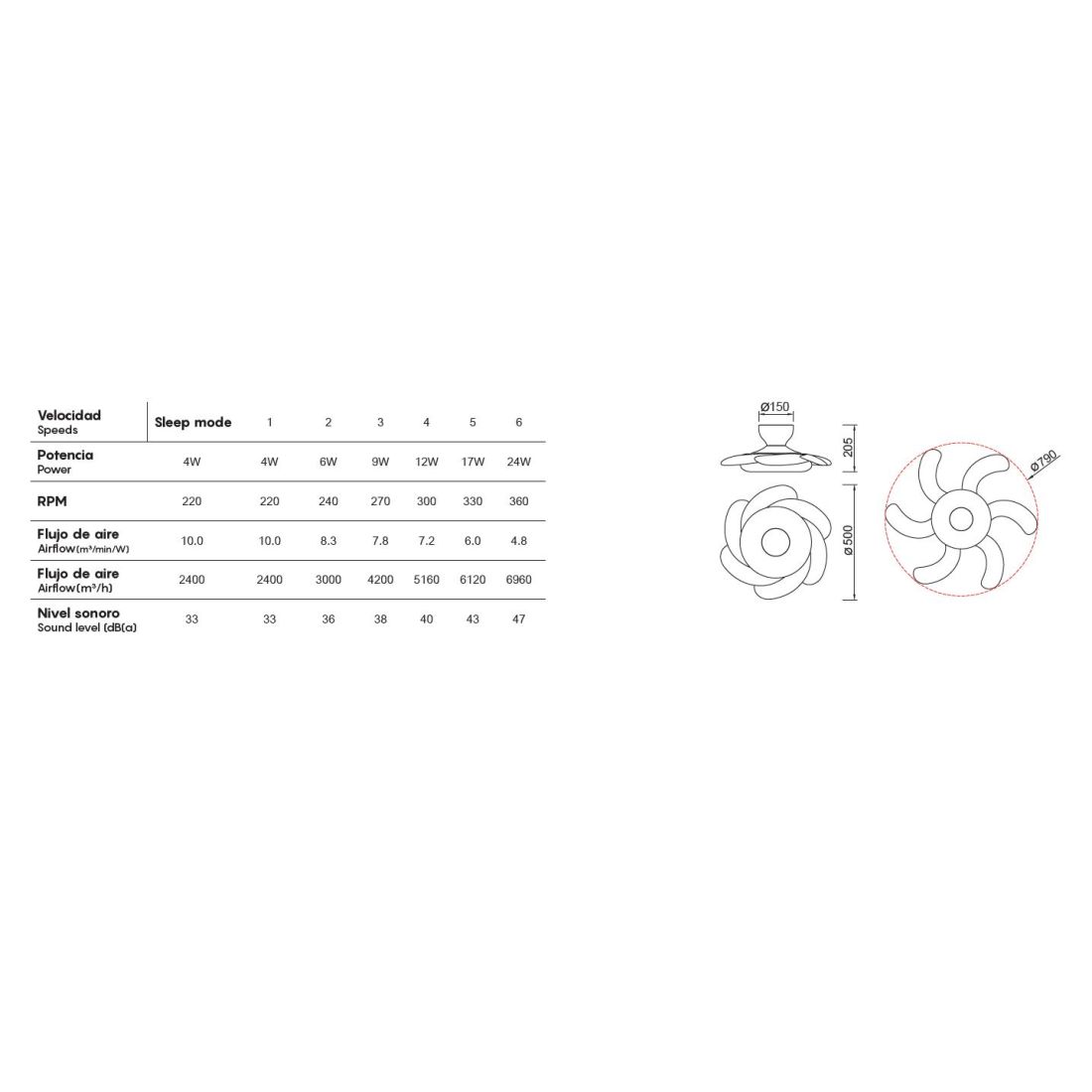 Il ventilatore è dotato di una sorgente luminosa a Led da 24W con intensità e temperatura colore regolabili, per adattarsi a ogni momento della giornata: da una luce calda 2700K fino ad una luce fredda 5000K. Tutte le funzionalità, accensione, regolazione della luce, e velocità della ventilazione sono gestibili in modo semplice e intuitivo tramite telecomando incluso nella confezione.