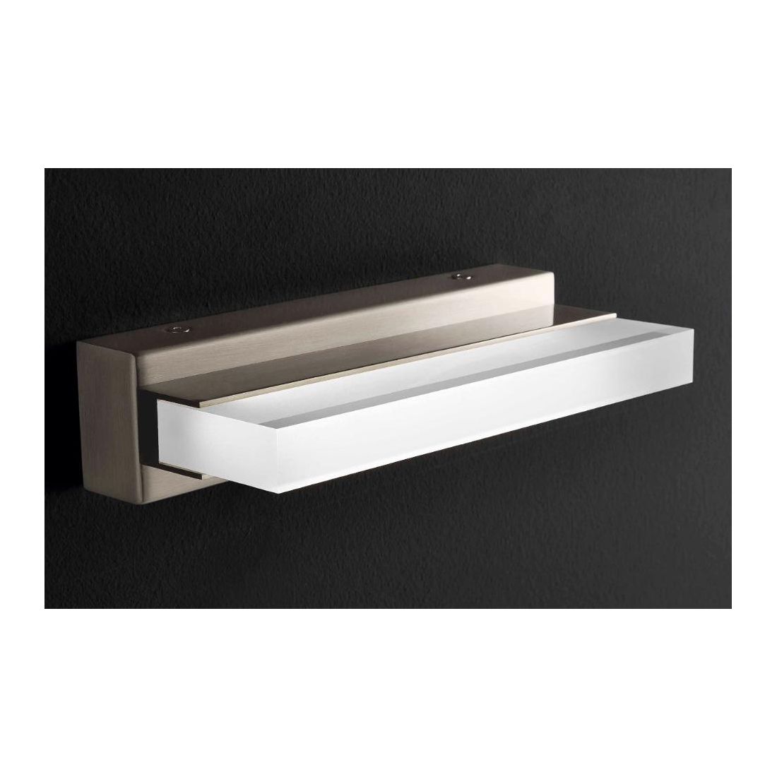 FRECCIA è un applique a parete della lunghezza di cm 21 realizzata interamente in metallo con finitura Nichel satinato con diffusore in acrilico.