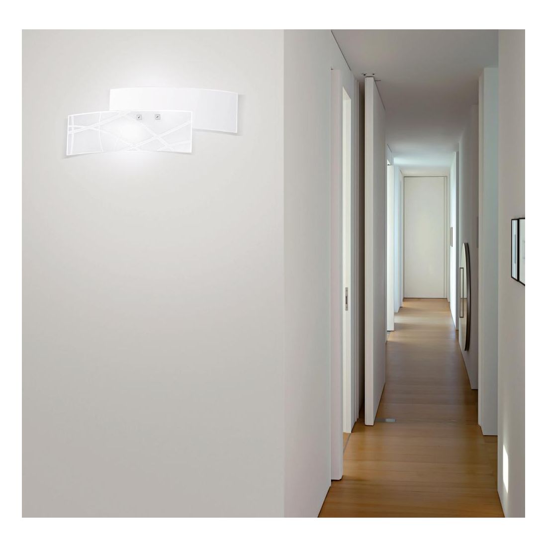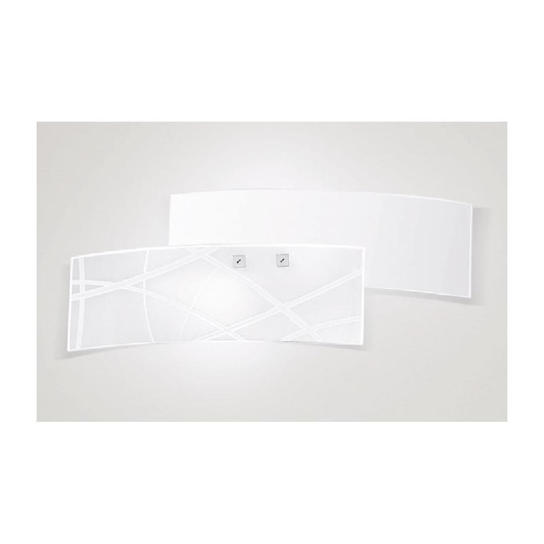 Applique dal design moderno realizzata con lastre curve di vetro bianco satinato, dove il vetro superiore è decorato con dei segni liberi che danno un tocco unico a questo prodotto; i piccoli dettagli sul vetro sono cromati e la struttura è in metallo con finitura cromo.