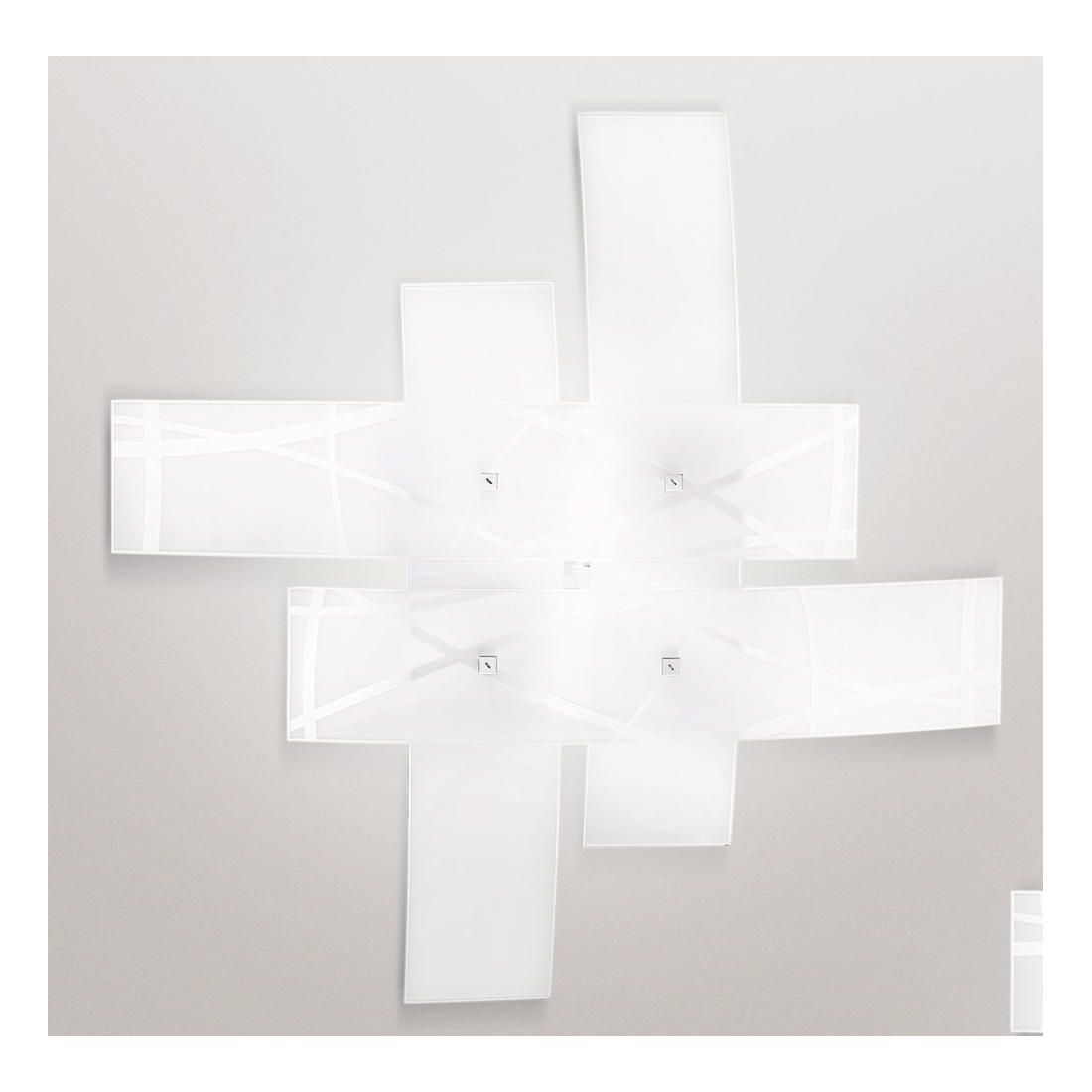 Plafoniera dal design moderno realizzata con quattro lastre curve di vetro bianco satinato, dove i due vetri superiori sono decorati con dei segni liberi che danno un tocco unico a questo prodotto; i piccoli dettagli sul vetro sono cromati e la struttura è in metallo con finitura cromo.