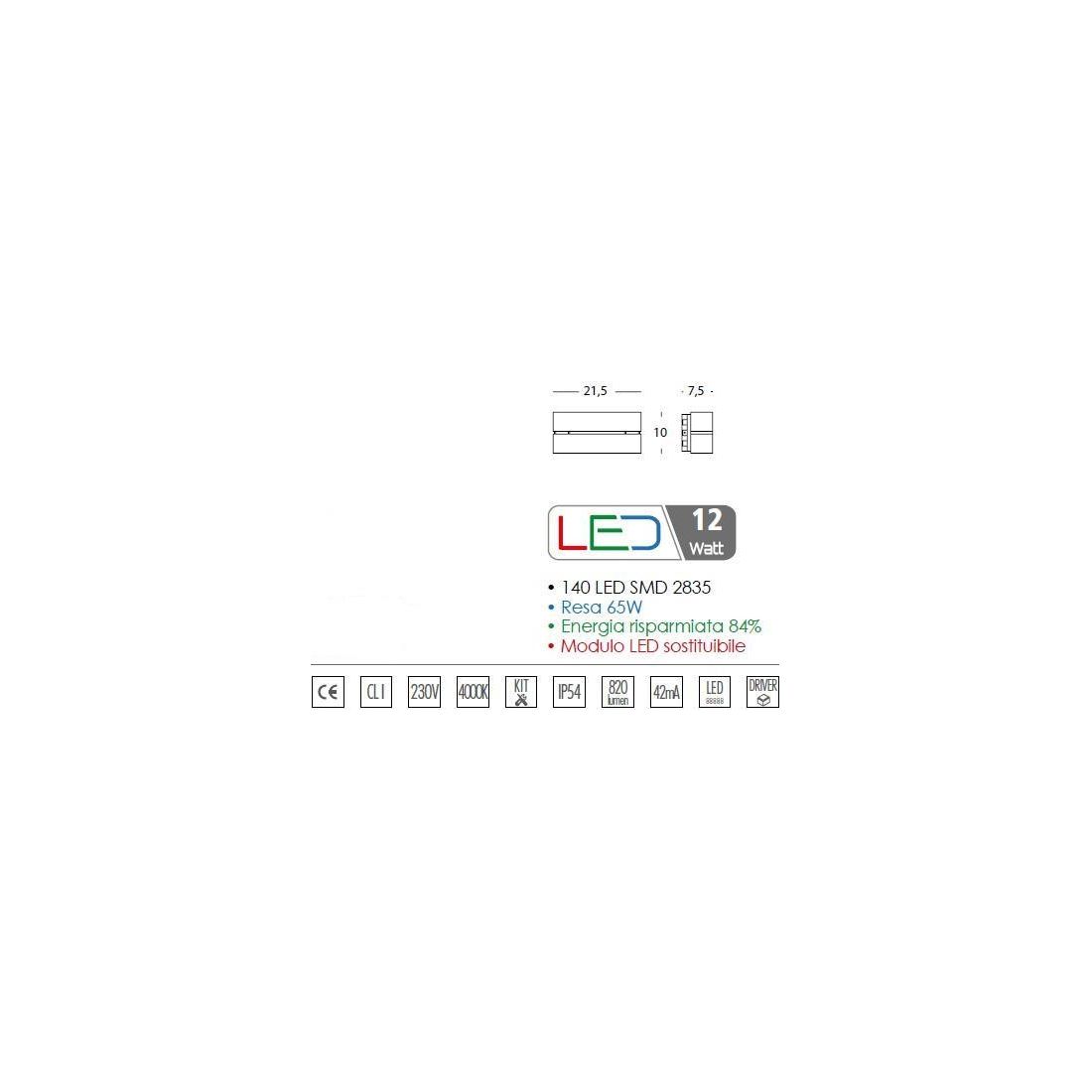 La sorgente luminosa è composta da un led SMD da 12w 820 lumen di resa con luce 4000k posizionato centrale nell'applique e coperto da diffusore in termoplastico opalino per evitare di vedere la puntinatura del Led. I led e il driver (alimentatore) all'interno dell'applique sono inclusi e di facile sostituzione in caso si dovessero bruciare.