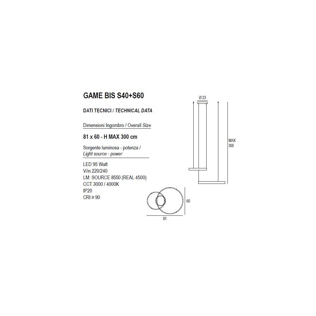 GAME BIS SOSPENSIONE A 2 ANELLI LED 200W BIEMISSIONE CCT 3000K-4000K IN 16 COLORI...