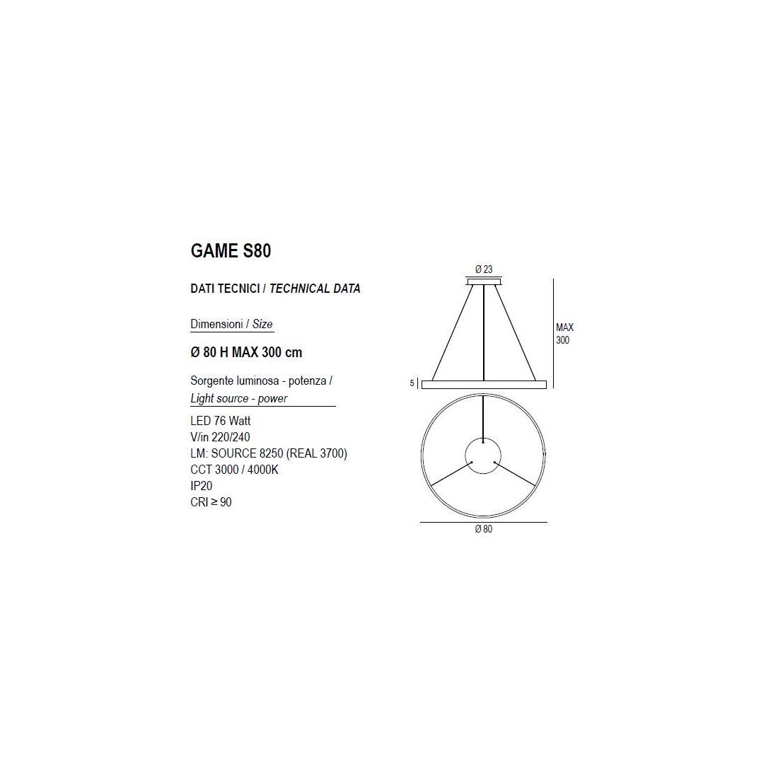 GAME S80 SOSPENSIONE SINGOLA CON ANELLO DI 80 CM BIEMISSIONE LED 76W CCT 3000K-4000K IN 19 COLORI