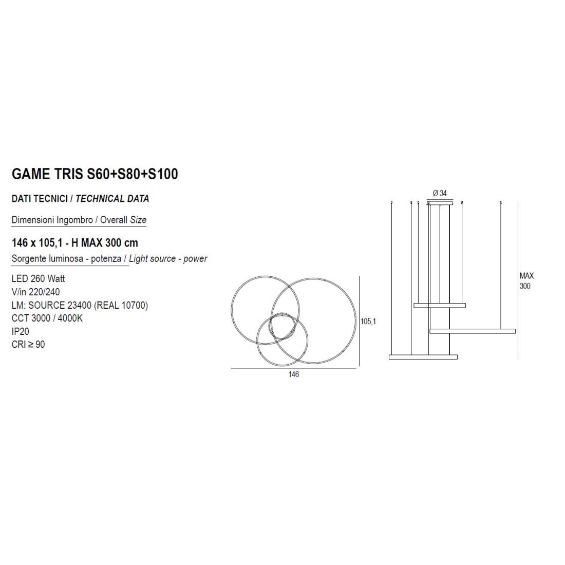 GAME TRIS SOSPENSIONE A 3 ANELLI LED 200W BIEMISSIONE CCT 3000K-4000K IN 16 COLORI...