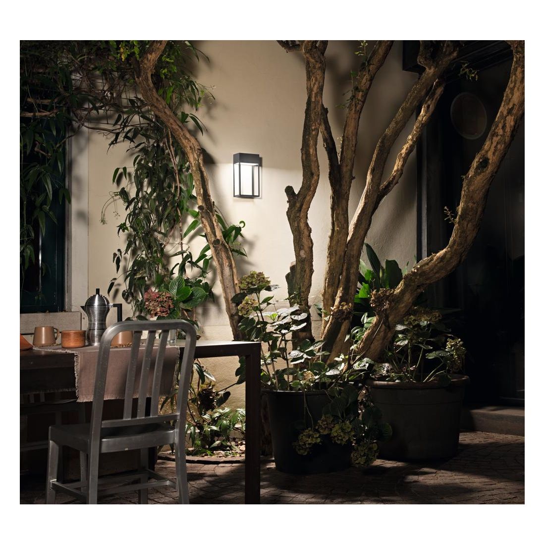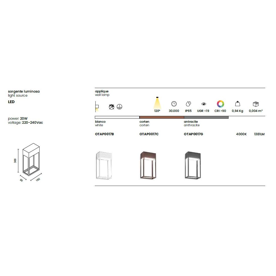 L’applique integra una sorgente luminosa a Led da 20W, capace di generare un flusso luminoso di 1381 lumen con una temperatura colore di 4000K (bianca naturale) perfetta per valorizzare gli spazi esterni senza alterarne i colori mantenendo un effetto luminoso sobrio e moderno.