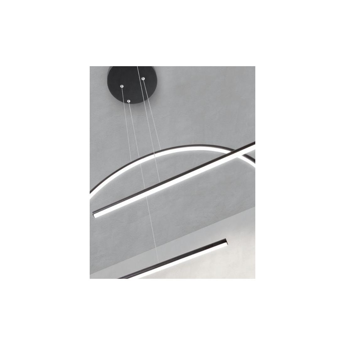 La struttura è realizzata in alluminio, disponibile nelle finiture Bianco o Nero (a vostra scelta), per adattarsi armoniosamente a diversi contesti di arredo. Dal rosone a soffitto si estendono tre cavi che sorreggono i diffusori semicircolari mentre due bacchette orizzontali sono sostenute da un innovativo sistema di decentramento. I cavi sono regolabili in lunghezza, permettendo di personalizzare l’altezza e la disposizione dei diffusori, offrendo infinite possibilità per creare una configurazione unica e personale.