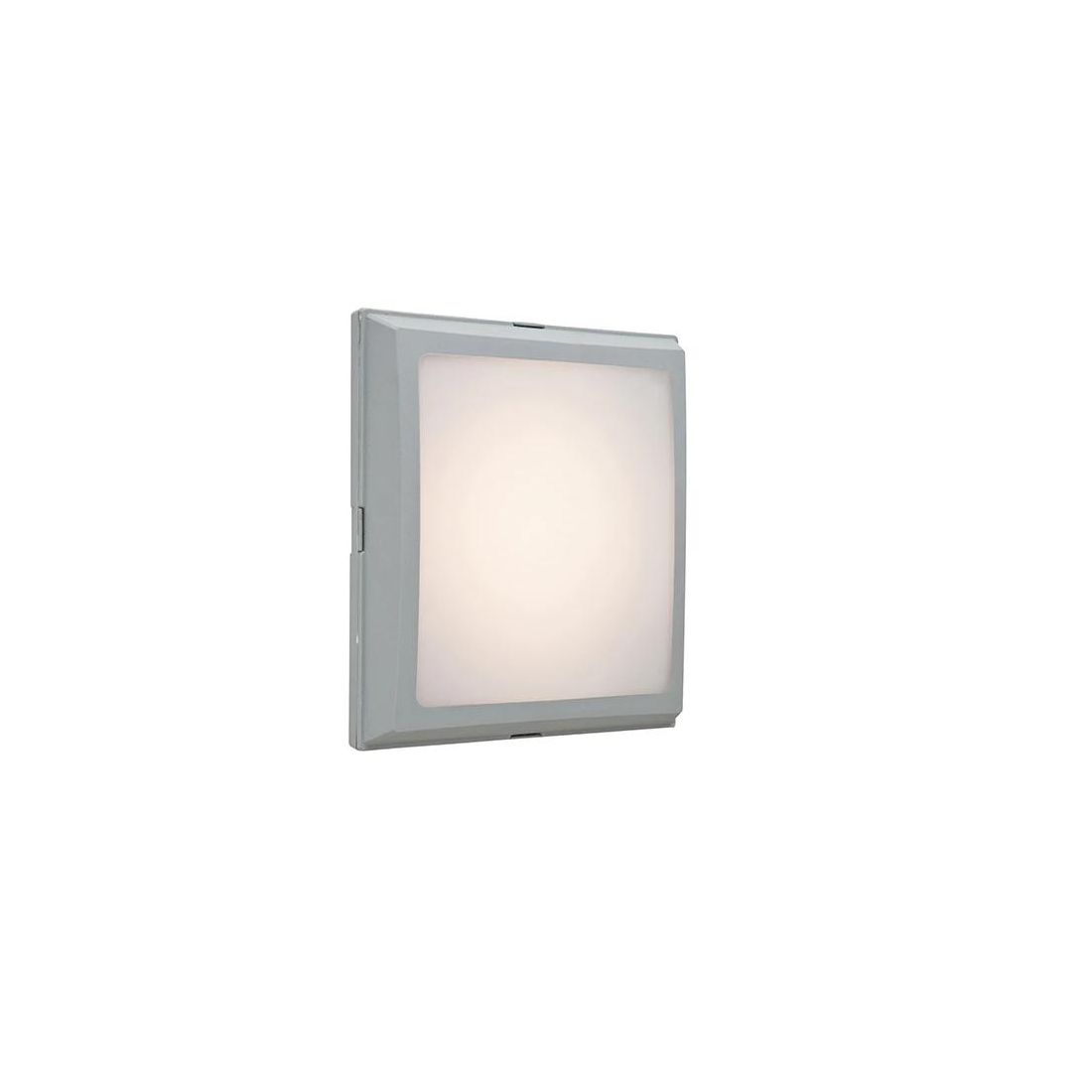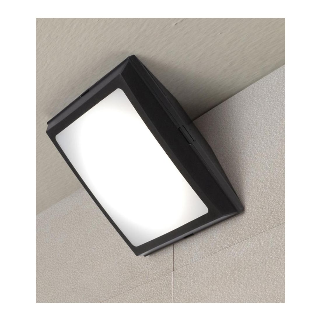 Plafoniera/applique di forma quadrata, senza viti a vista, realizzata in resina antiurto stabilizzata ai raggi UV inattaccabile da ruggine e corrosione, disponibile nel colore Nero, Grigio oppure Bianco (a vostra scelta); lo schermo è prodotto in PMMA bianco ed è un prodotto idoneo per installazione a parete o al suolo e a palo.