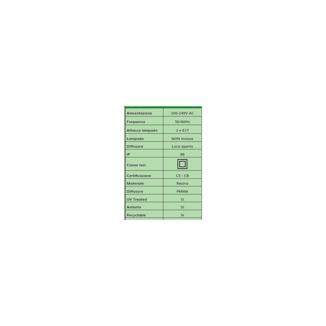 Al suo interno trovate 2 portalampade con attacco E27 è possibile inserire qualsiasi tipo di lampadina a Led, a basso consumo energetico, del colore e della potenza che più desiderate.