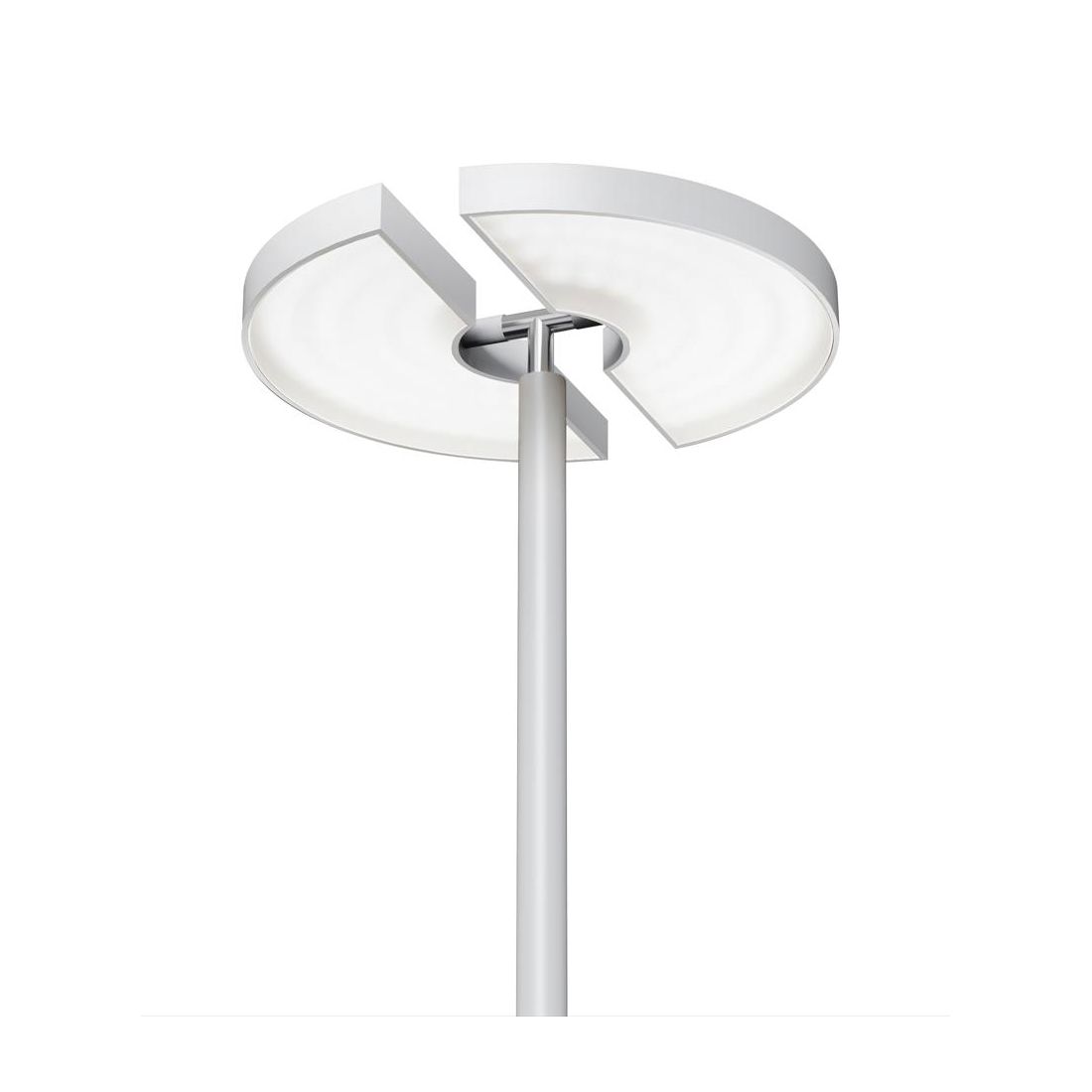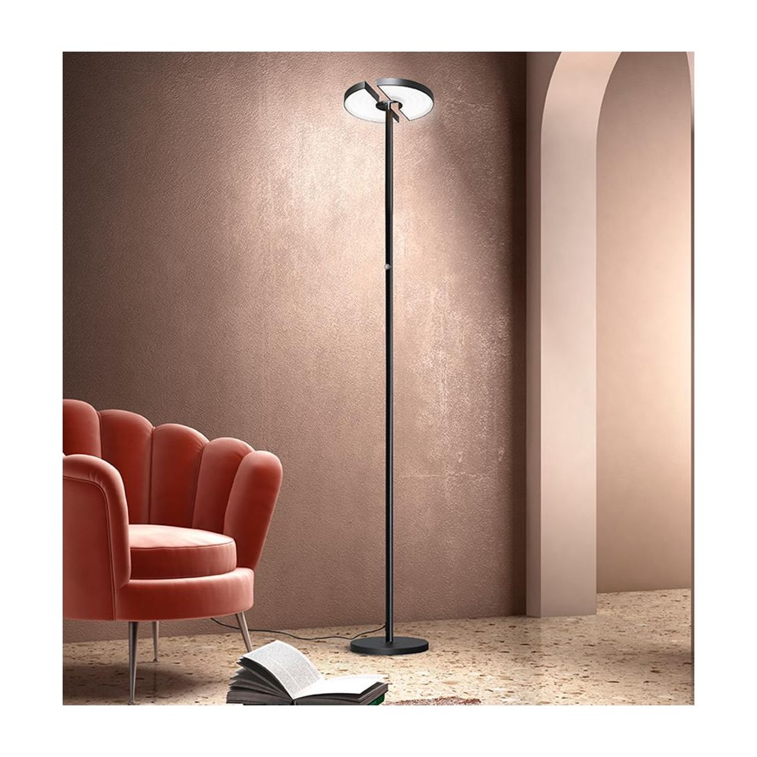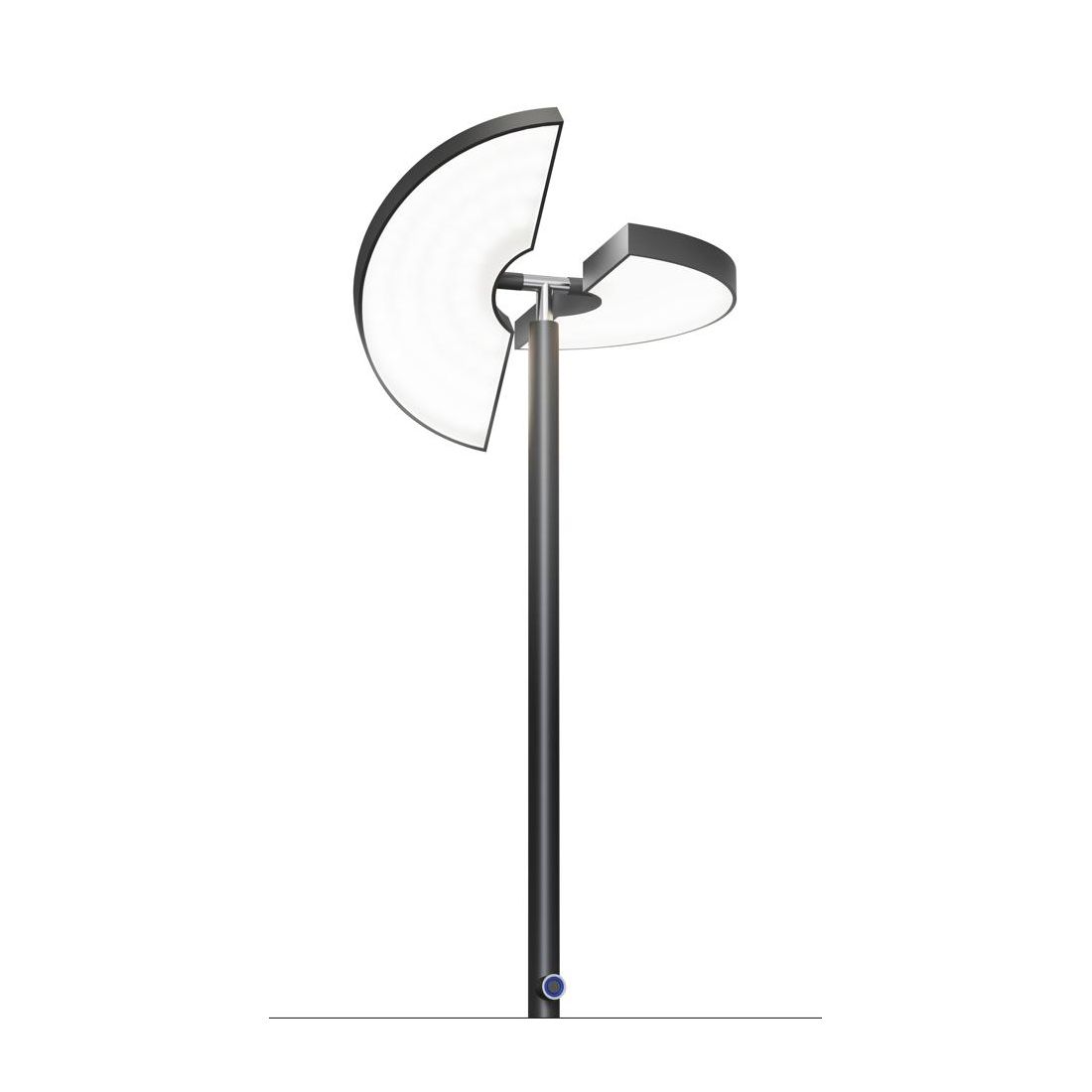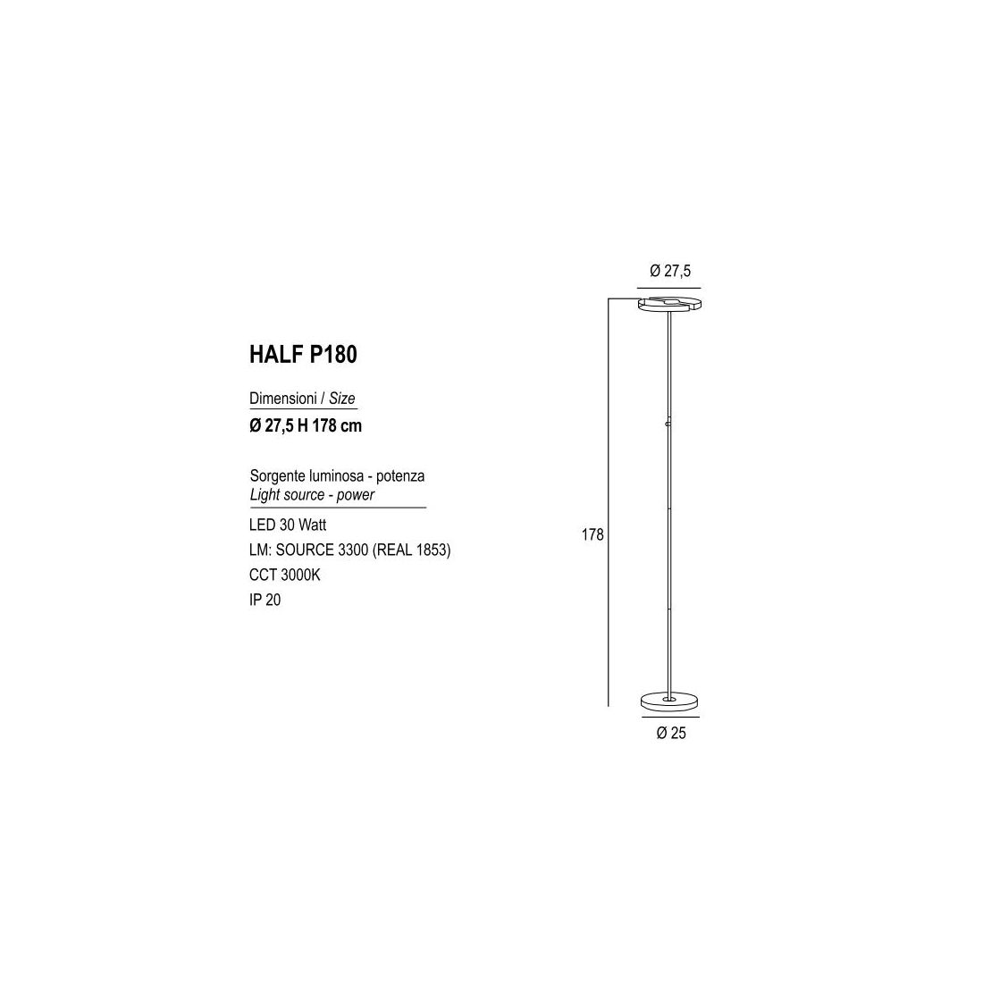 La piantana integra una sorgente luminosa a Led da 30w con resa luminosa di 1853 lumen e con una luce bianca calda 3000k Dimmerabile tramite il pulsante posto sull' asta; il diffusore orientabile, diviso a metà, fa si che la luce possa essere regolata e direzionata in diverse direzioni per illuminare specifiche aree o oggetti.