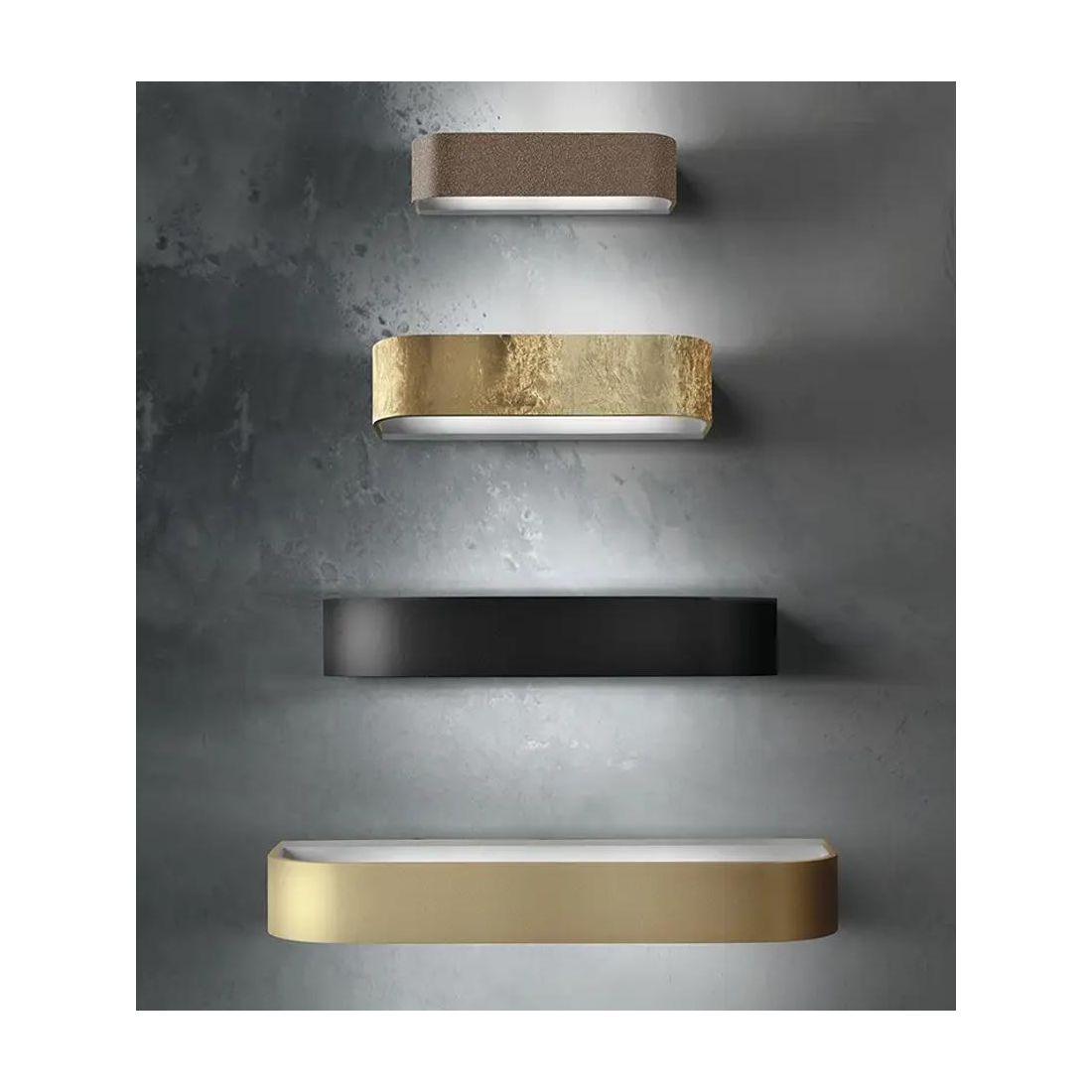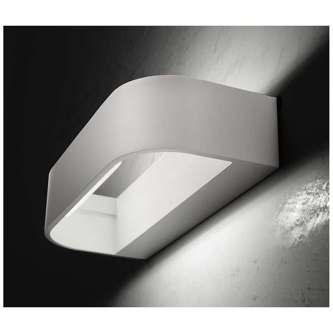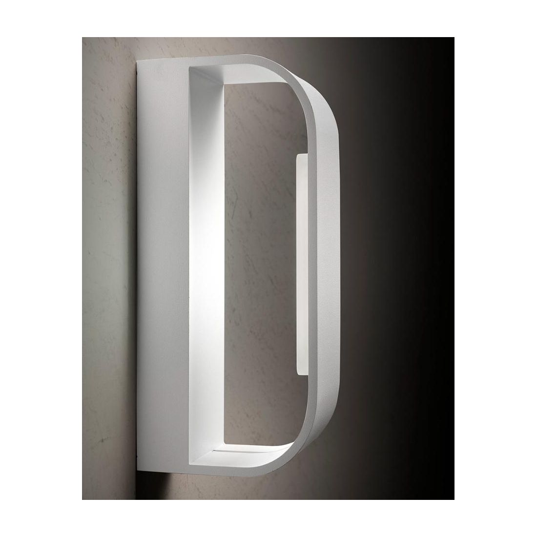 Lampada da parete dal design moderno con una forma stondata, realizzata in alluminio, vuota al suo interno, che produce una luce indiretta sulla parete orientata sia verso l'alto che verso il basso.