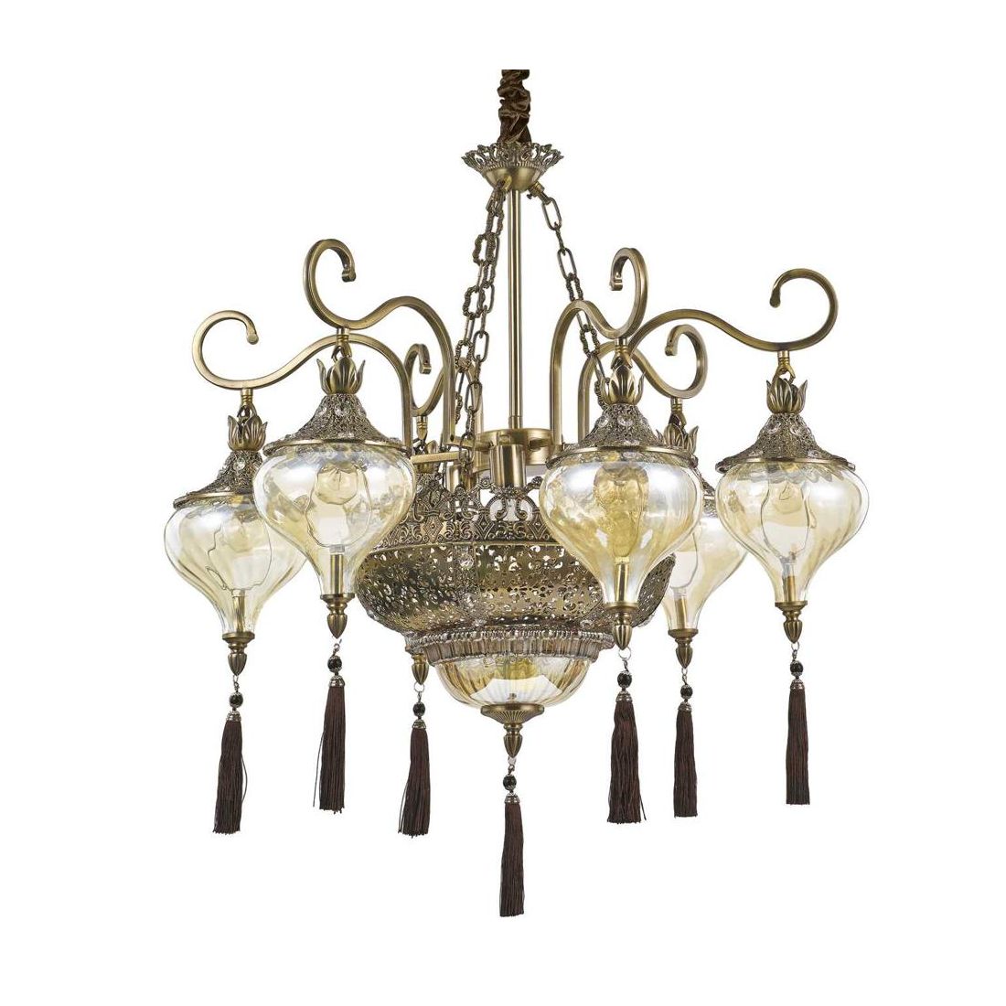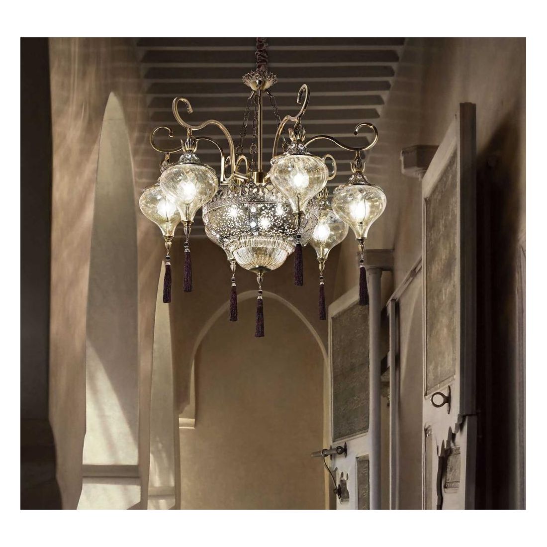 Lampadario a sospensione dallo stile etnico dove la struttura trae ispirazione delle tradizionali lampade del Marocco e si caratterizza per la lavorazione della montatura realizzata in metallo con finitura Brunito con incisioni decorative a rilievo.