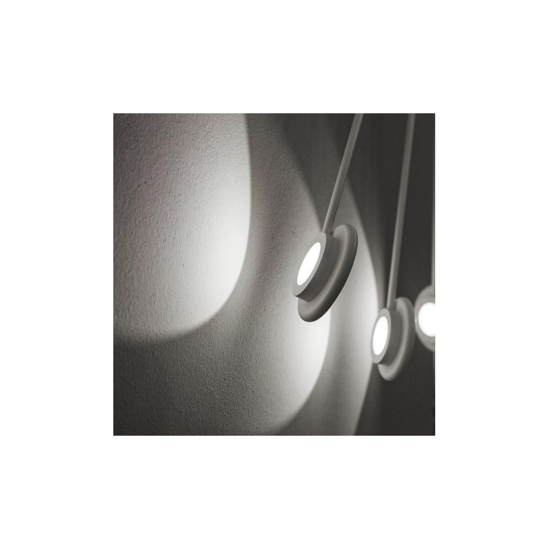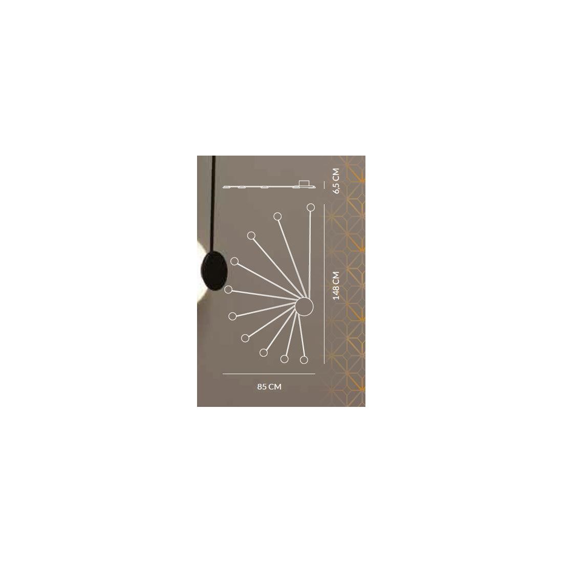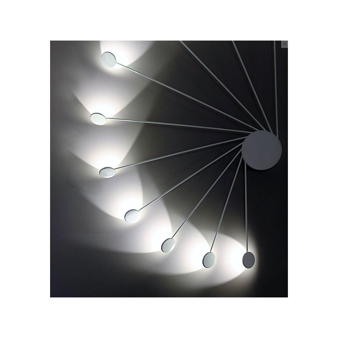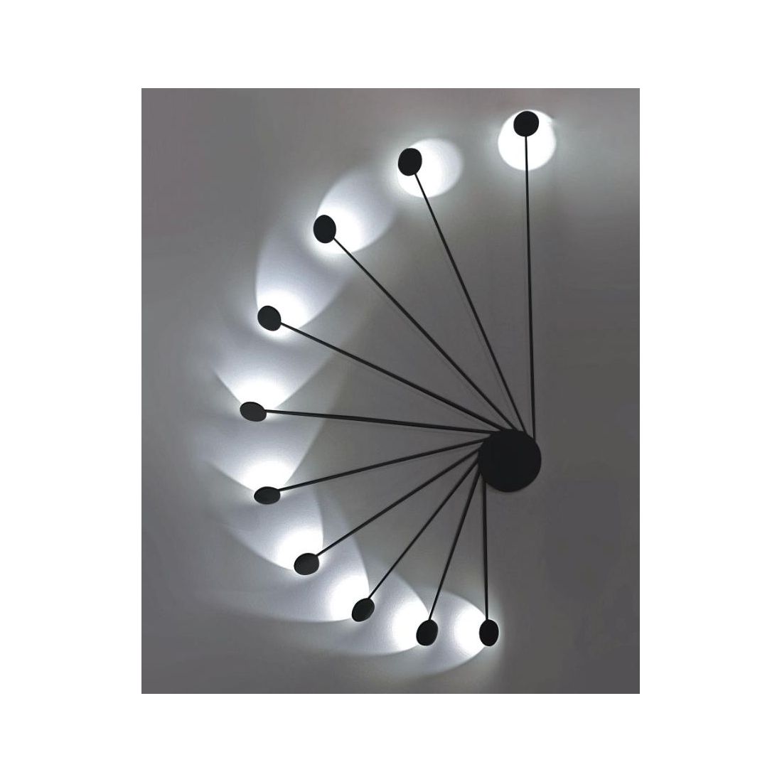 Si presenta con una struttura in alluminio con finitura Bianca o Nera (a vostra scelta) formata da una piastra rotonda dalla quale si diramano 10 bracci lineari con Led circolari orientabili in vetro.