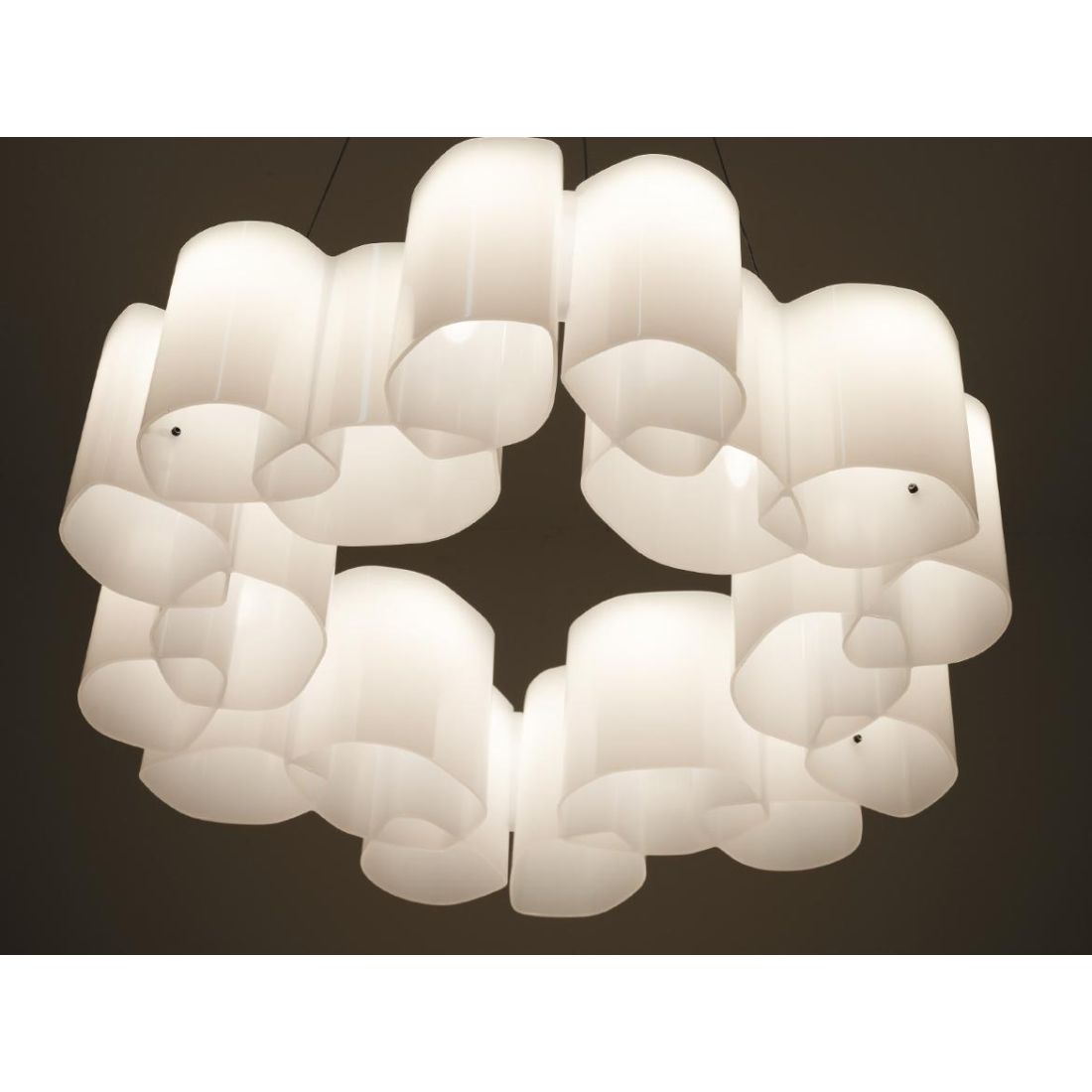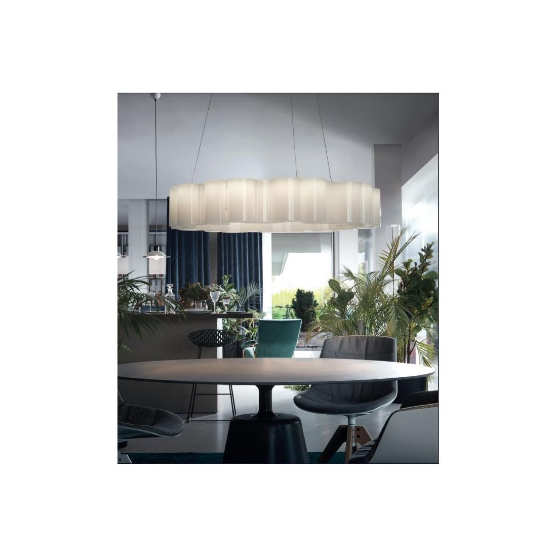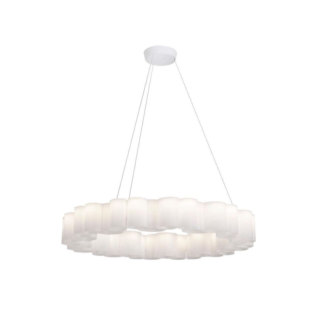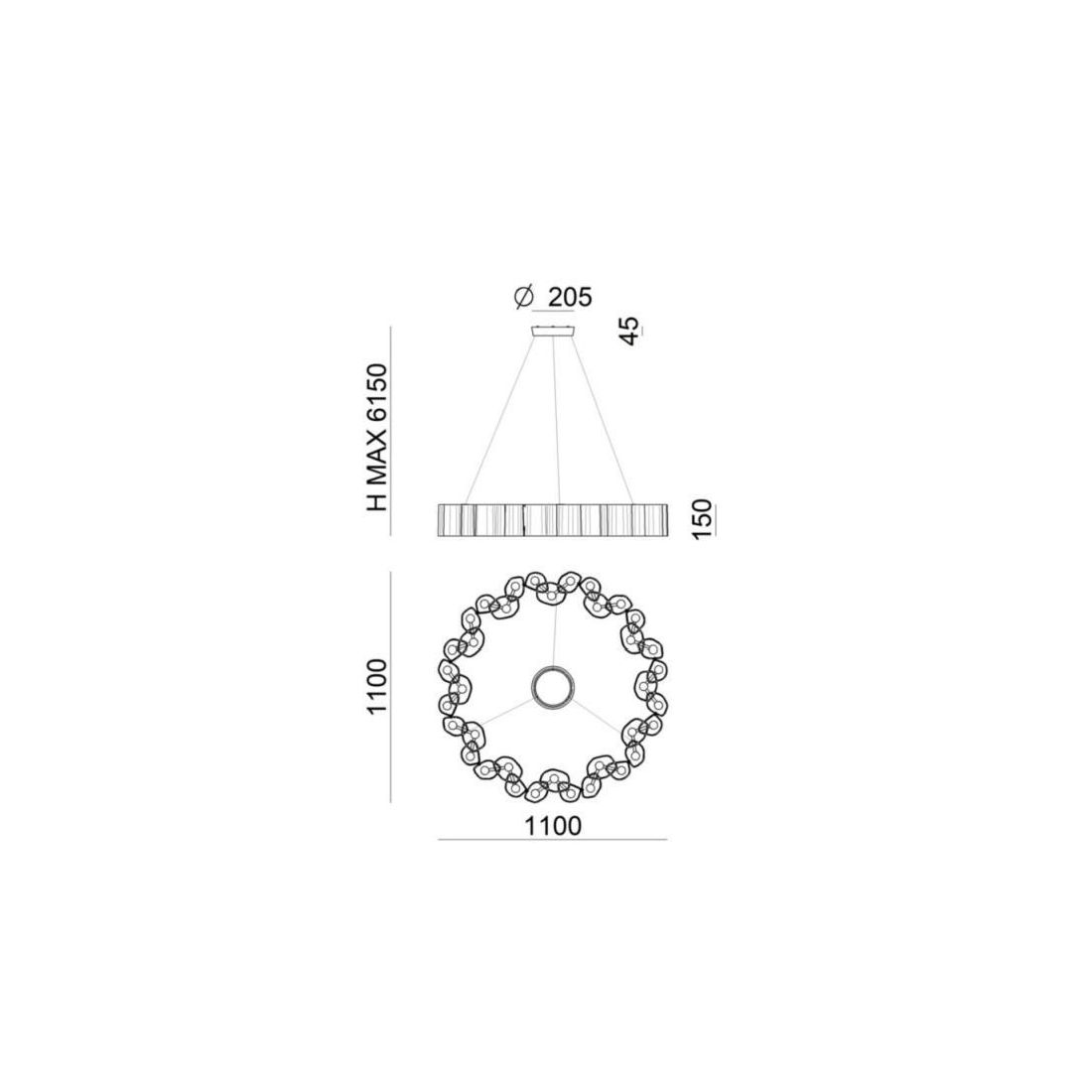 Il lampadario è dotato di cavetti in acciaio regolabili in lunghezza in modo da poter posizionare la sospensione all'altezza da voi più desiderata; la sorgente luminosa LED da 105w, con luce Dimmerabile DALI, di colore bianco caldo, con distribuzione luminosa General Lighting, è composta da 360 LED topled, con una CCT 2700 K ed un CRI 90; il flusso luminoso della sorgente è di 10844 lm, con un'efficienza nominale di 103.3 lm/W.