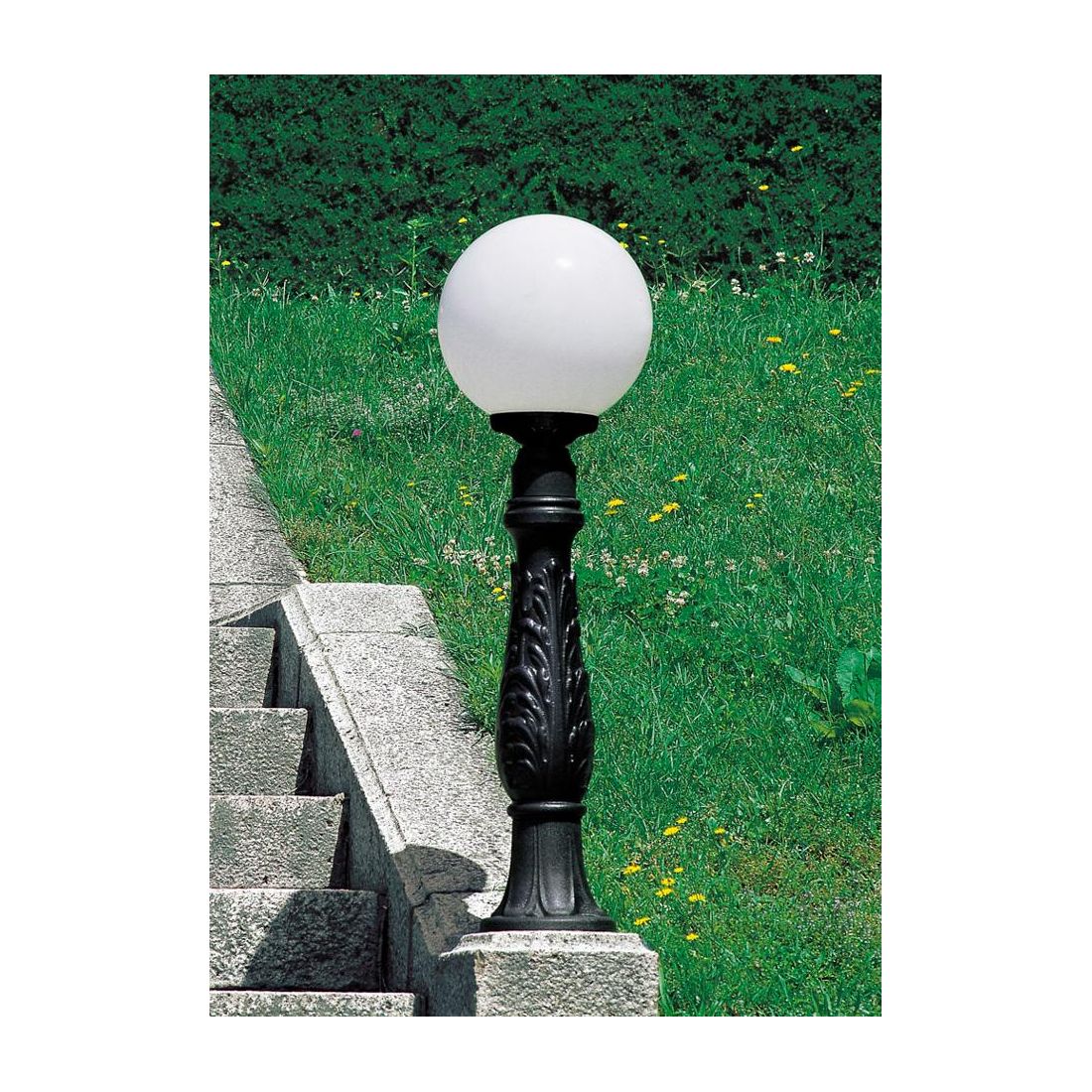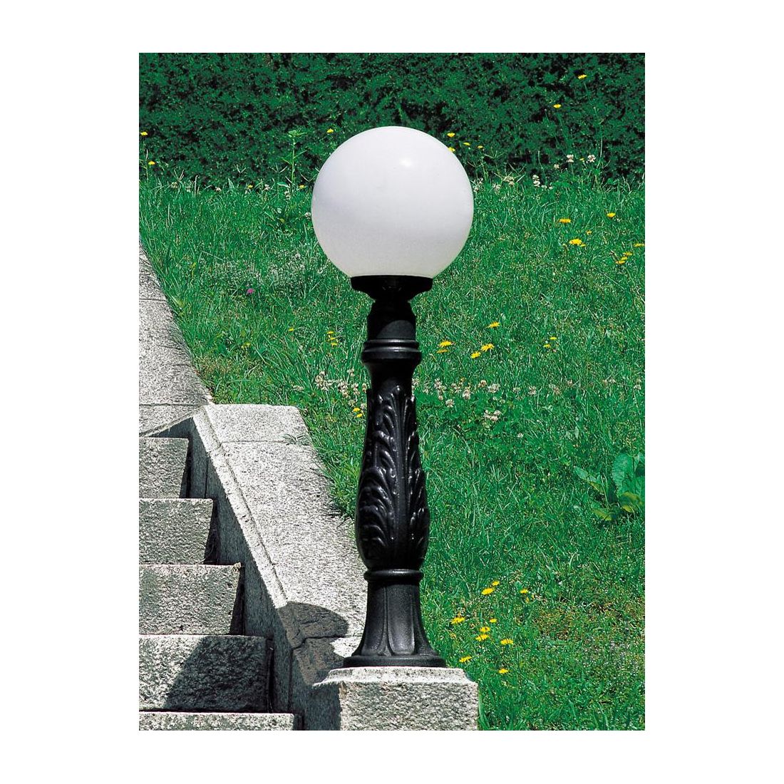 Palo da giardino, dallo stile classico, con un altezza di cm 100, realizzato in resina antiurto, di colore Nero, stabilizzata ai raggi UV inattaccabile da ruggine e corrosione con sfera globo di diametro cm 30 in PMMA bianco opale.