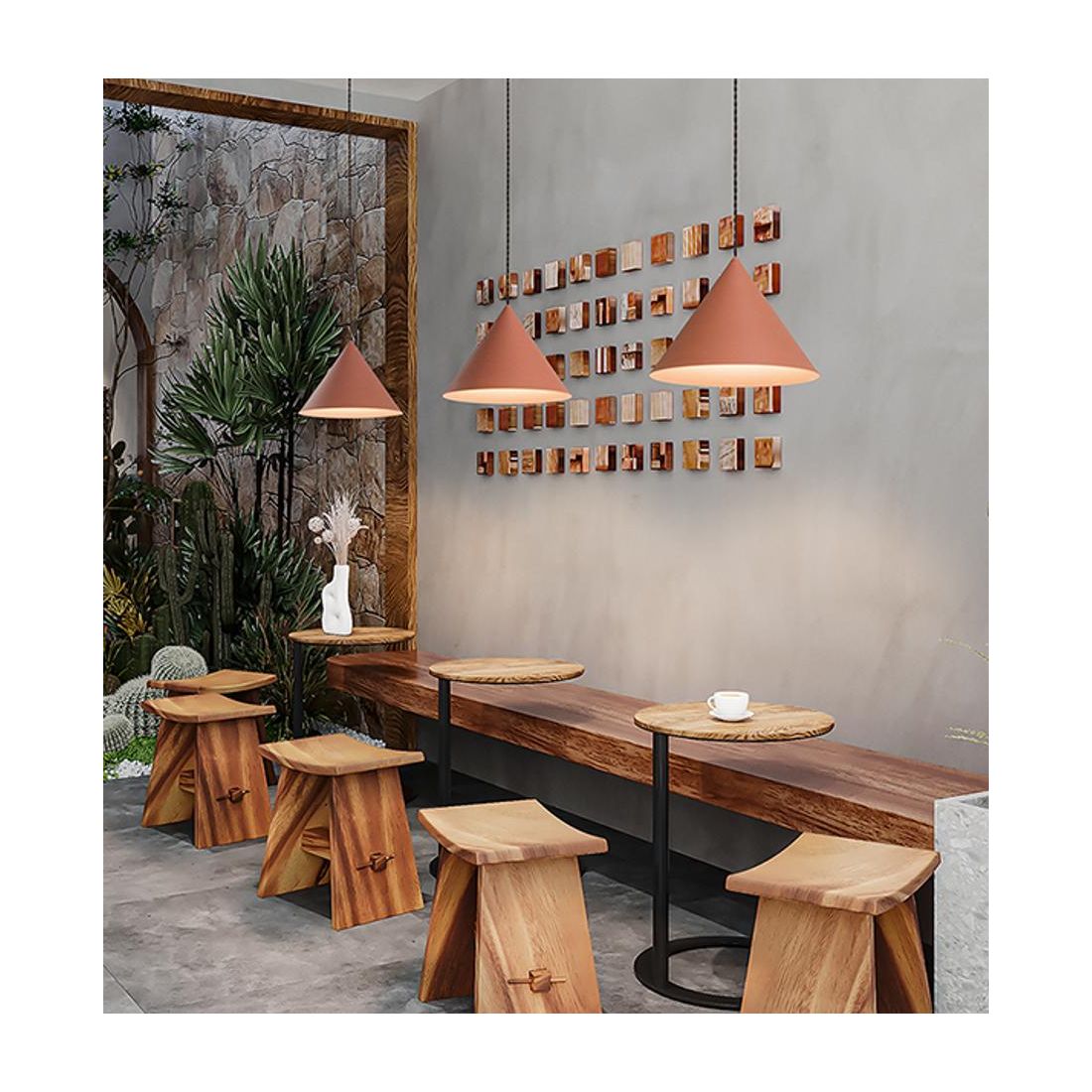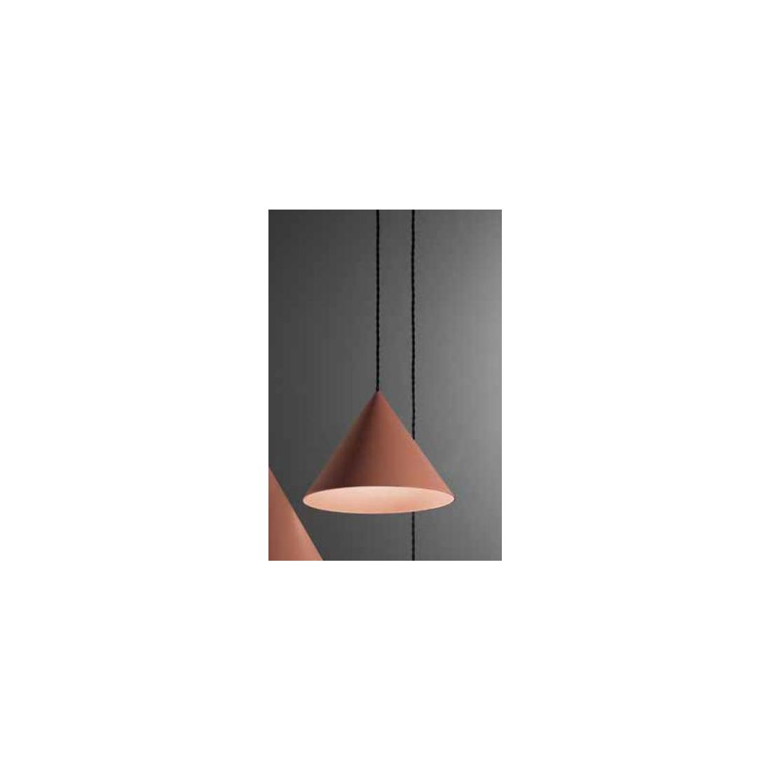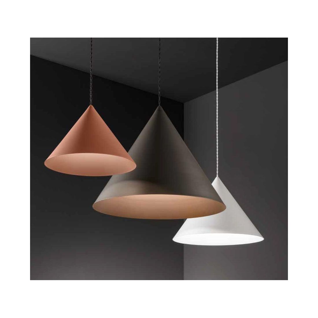 Sospensione singola, dal design moderno, che si presenta con base a soffitto in metallo e con il diffusore, di forma conica, realizzato in alluminio disponibile nelle finiture Bianco, Terracotta e Grigio metallizzato con l'interno verniciato di Marrone.
