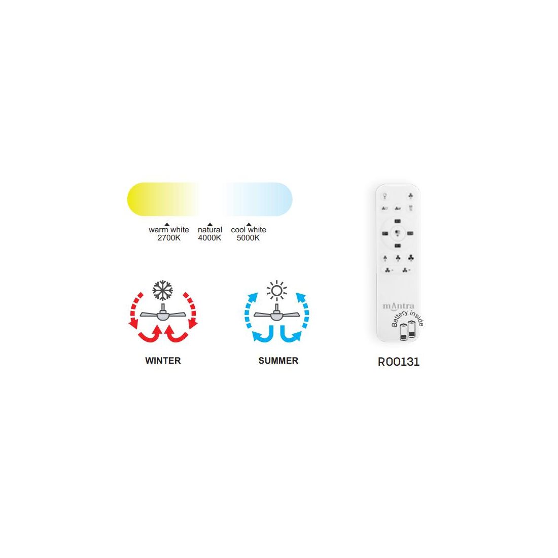 Grazie al telecomando in dotazione, è possibile selezionare le tre velocità delle pale e regolare la luminosità della luce LED integrata da 55W potendo scegliere tra tre diverse temperature di colore: luce calda 2700K, luce bianca naturale 4000K oppure luce fredda 5000K; la luce è dimmerabile all'infinito.