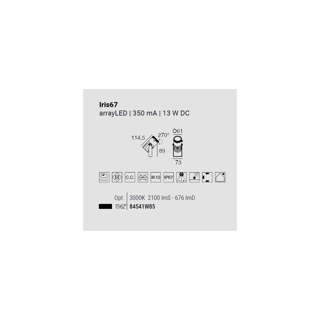 La caratteristica distintiva di Iris 67 è la sua ottica con tecnologia Zoom. Questo sistema innovativo ti consente di regolare l'ampiezza del fascio luminoso in base alle tue esigenze, in qualsiasi momento, variando l'apertura da 15° a 62°.