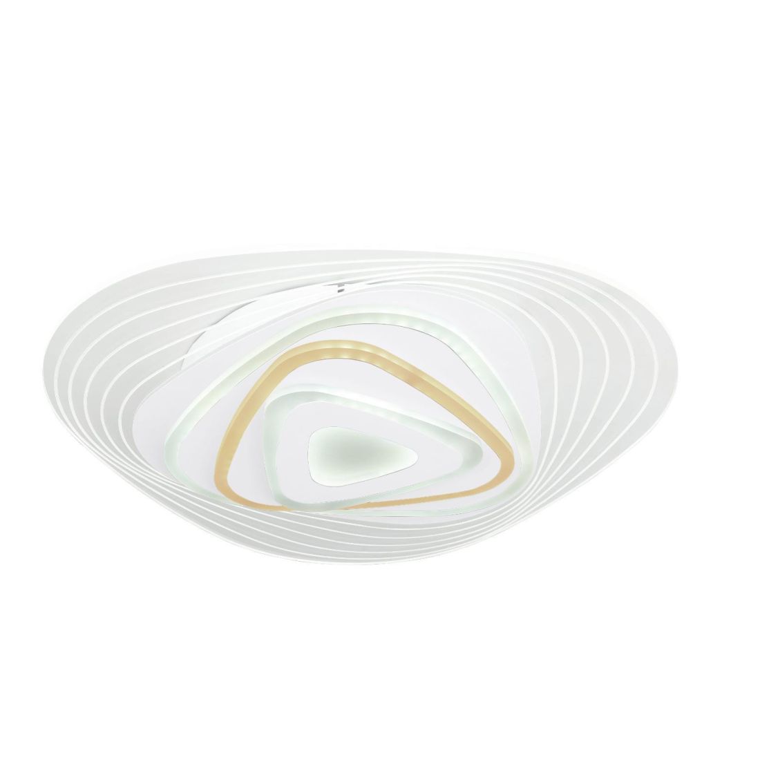 Lampada da soffitto dal design moderno ed originale, di ultima generazione, con una struttura in metallo con finitura Bianco opaco che integra quattro diffusori, con forme smussate, che integrano sorgenti luminose a Led; questa struttura bianca è contornata da una cornice trasparente che rende l'oggetto ancora più particolare.
