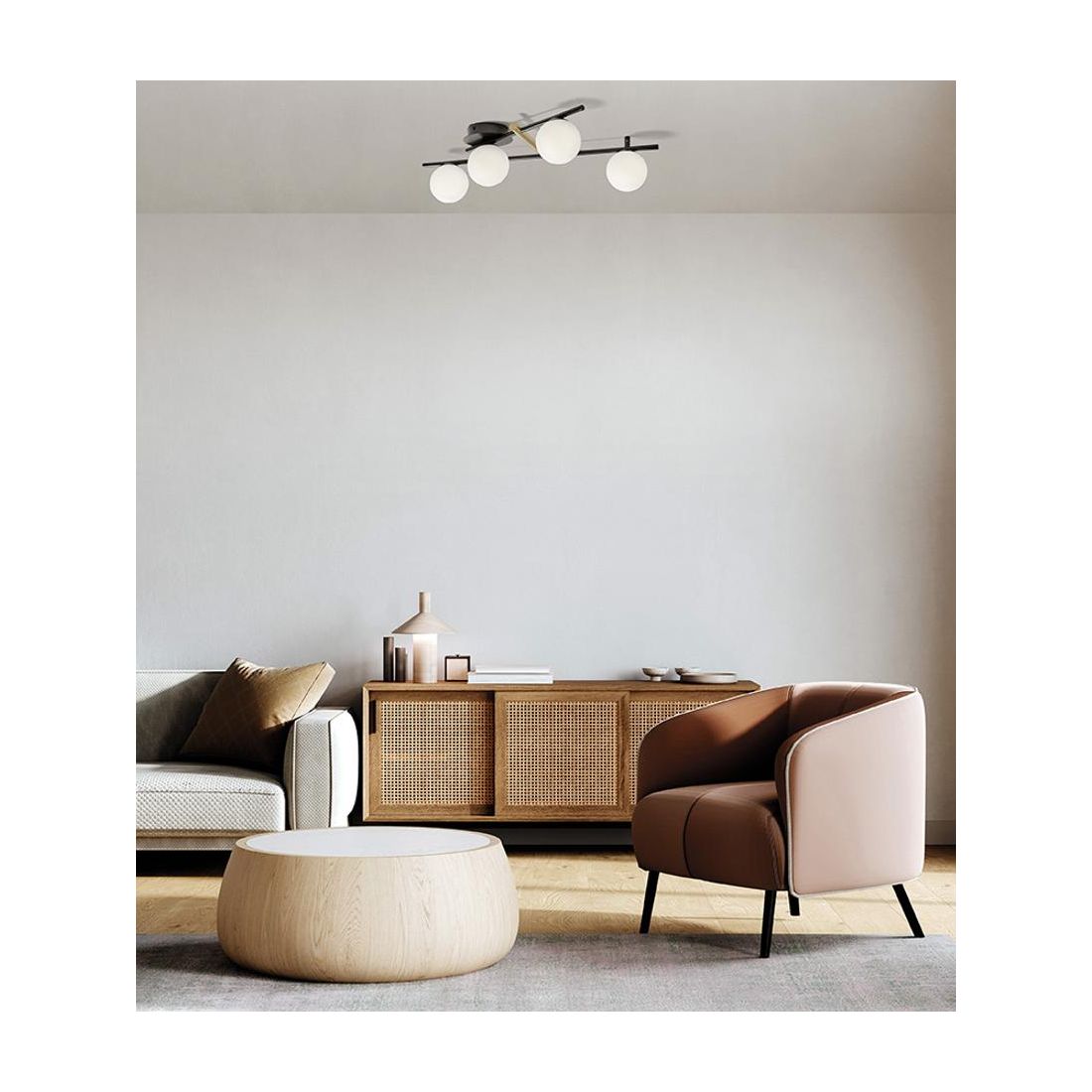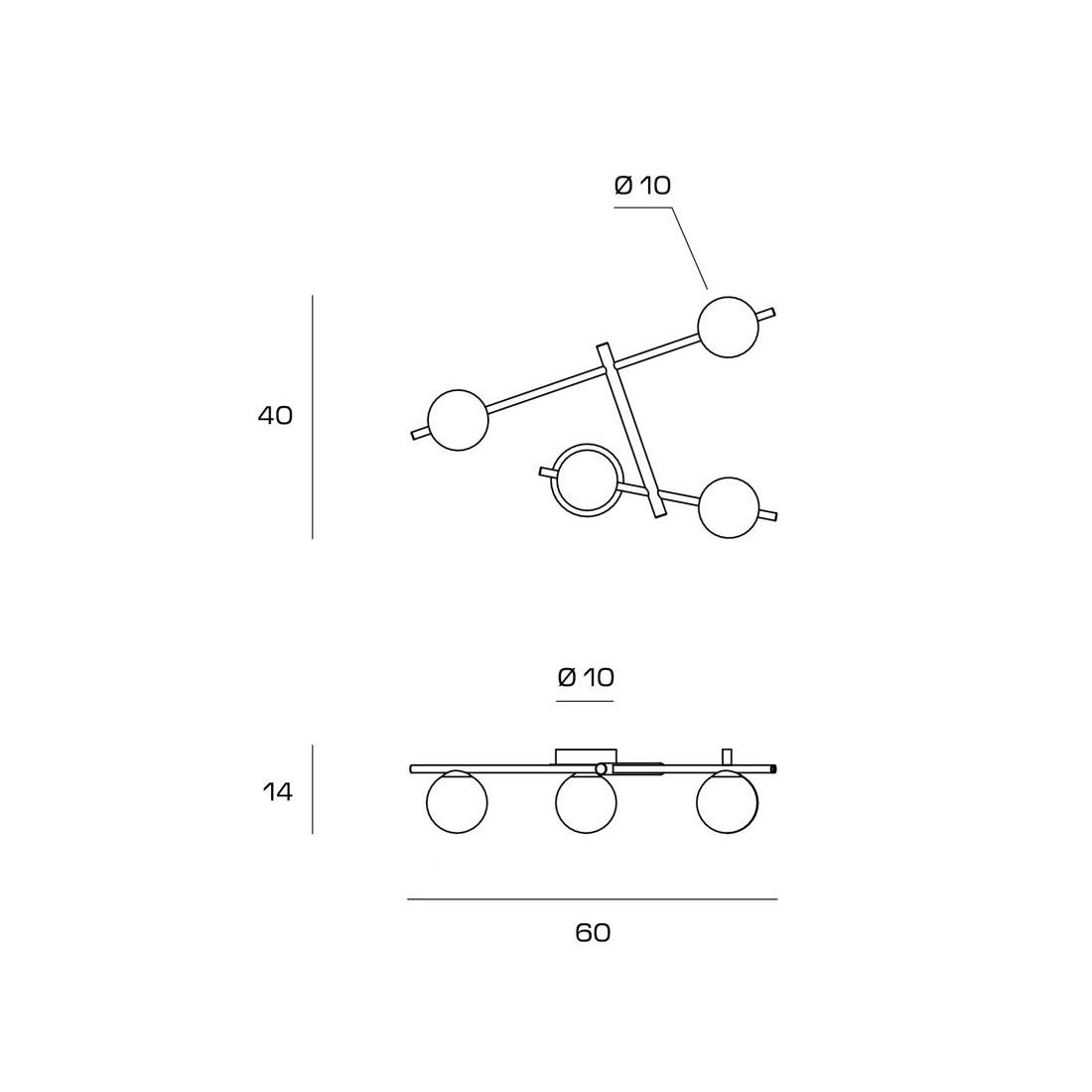 Plafoniera dal design contemporaneo e sofisticato con una struttura composta da due sottili aste in metallo con una finitura Liquirizia Nera che sorreggono le 4 sfere in vetro bianco latte, disposte in modo dinamico, con dettaglio centrale in oro spazzolato che aggiunge un tocco di classe valorizzando ulteriormente il design.