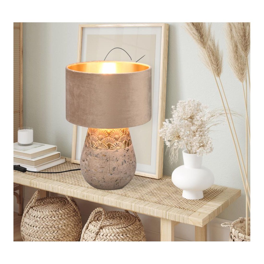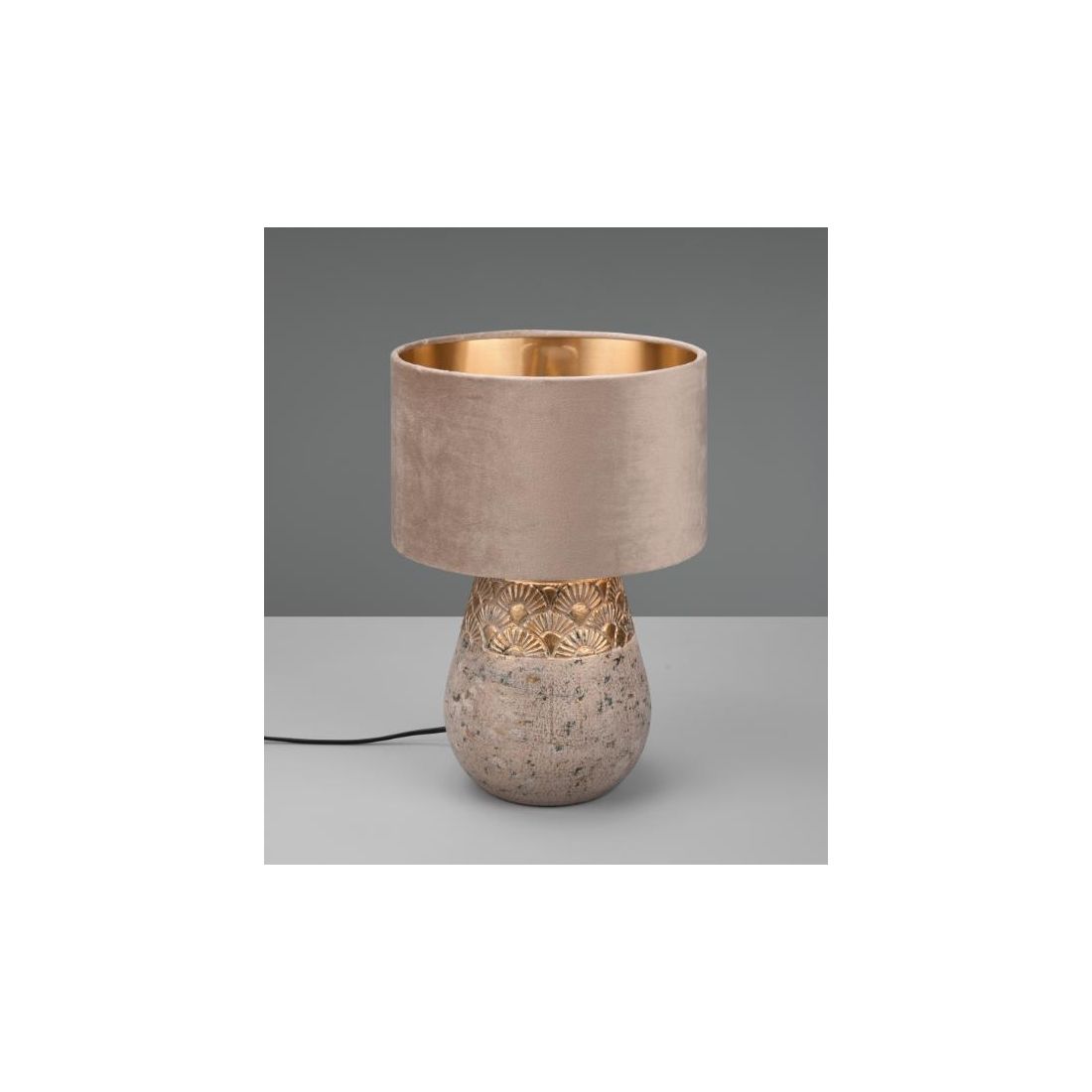 Kiran si presenta con una base in ceramica decorata di colore Grigio con un paralume in velluto beige. L'emozionante combinazione dei materiali velluto e ceramica garantisce un colpo d'occhio straordinario.