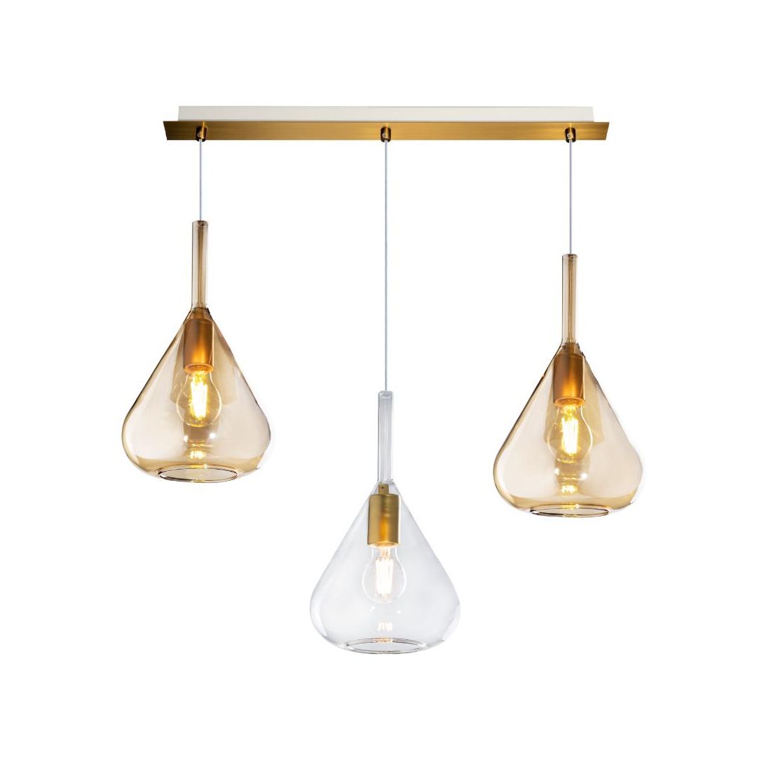 KONA SOSPENSIONE CON DECENTRO FINITURA OTTONE CON 3 DIFFUSORI A CONO IN VETRO COLORATO