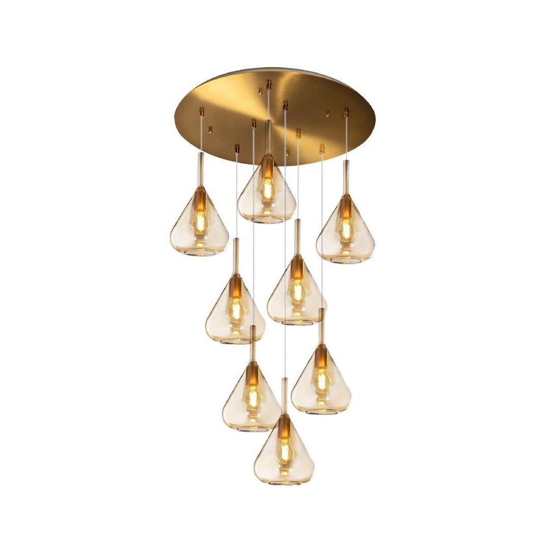KONA SOSPENSIONE TONDA IN FINITURA OTTONE CON 3 DIFFUSORI A CONO PENDENTI IN VETRO...