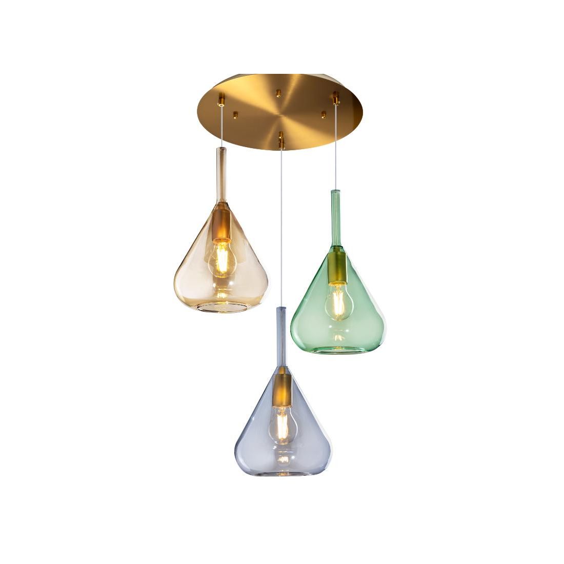 KONA SOSPENSIONE CON DECENTRO FINITURA OTTONE CON 3 DIFFUSORI A CONO IN VETRO COLORATO