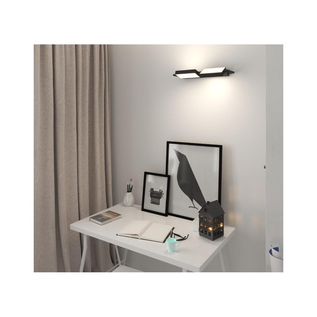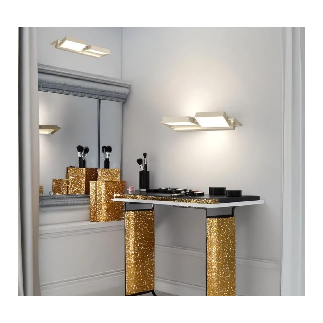 Dotata di due diffusori satinati, ruotabili fino a 350°, che consentono di direzionare i fasci luminosi in modo preciso offrendo un' illuminazione d'accento personalizzata su oggetti, pareti o aree specifiche. Questa funzionalità la rende ideale sia per illuminazione diretta che indiretta adattandosi con versatilità alle esigenze funzionali ed estetiche di ogni ambiente.