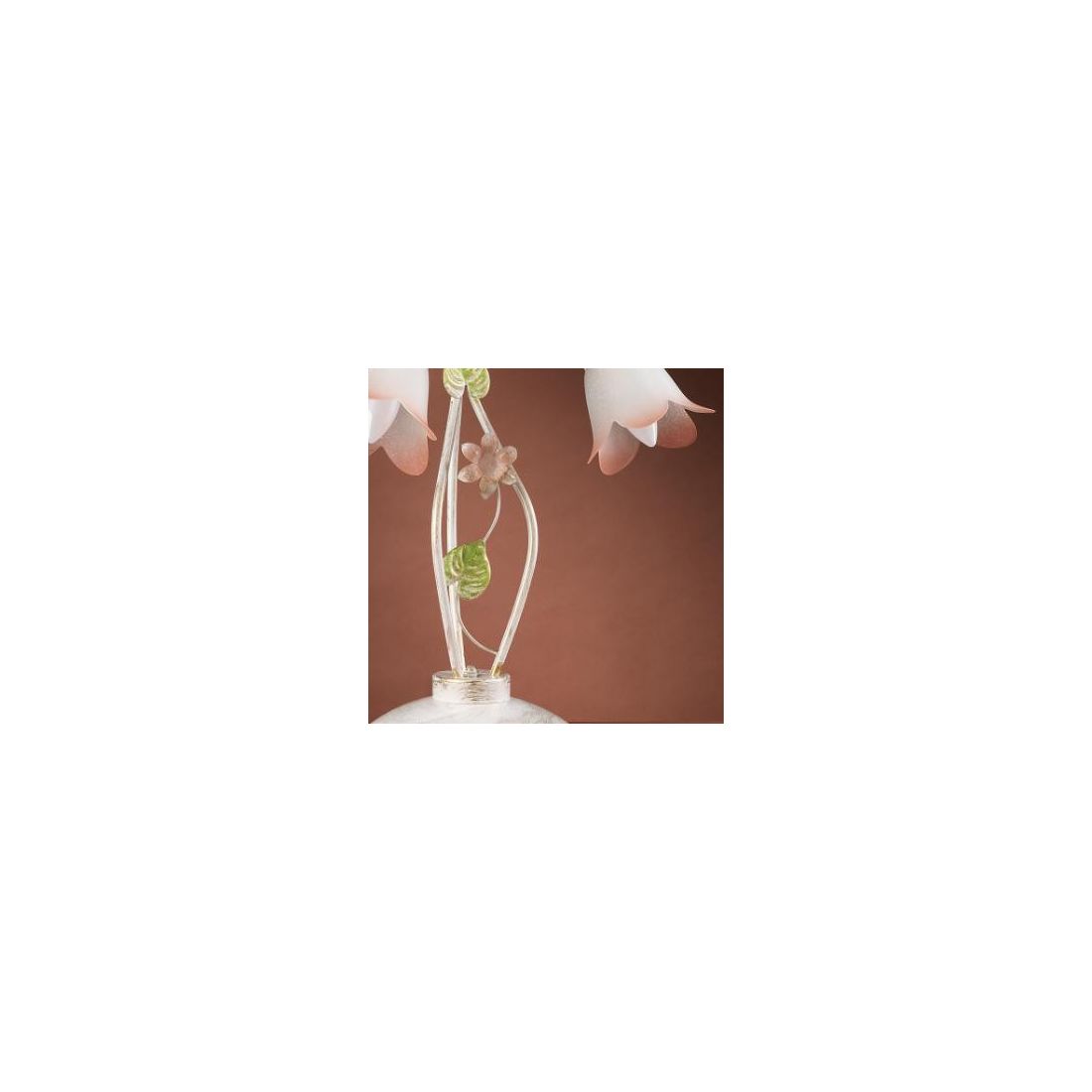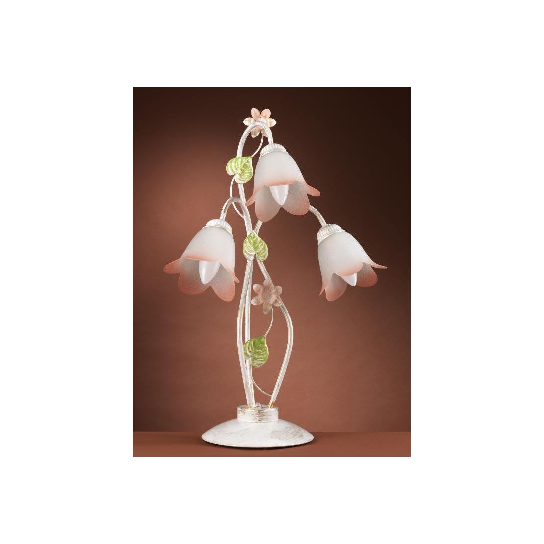 Lampada da tavolo a 3 luci con uno stile classico interpretato in una chiave moderna che si presenta con una struttura, dipinta a mano in Italia, realizzata in metallo con una finitura Bianca che presenta un effetto anticato ottenuto con spennellature dorate; la lampada viene arricchita con fiori rosa e foglie verdi ornamentali, sempre in metallo, e i paralumi, a forma di fiore, sono realizzati in vetro bianco satinato e presentano una sfumatura rosa sui petali che riprende il colore delle decorazioni.