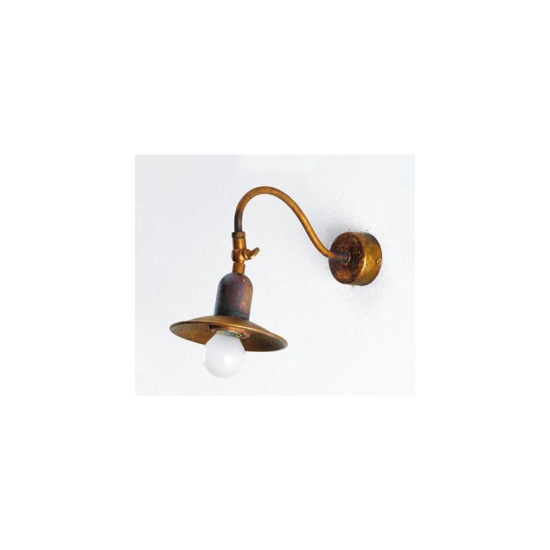 Lampada da parete dallo stile rustico ideale per l'illuminazione del vostro ingresso, del corrodoio, vano scala o della taverna interamente realizzata in Ottone invecchiato con il piatto del diametro di cm 14 corredato di snodo in modo da poter orientare il punto luce dove più vi necessita.