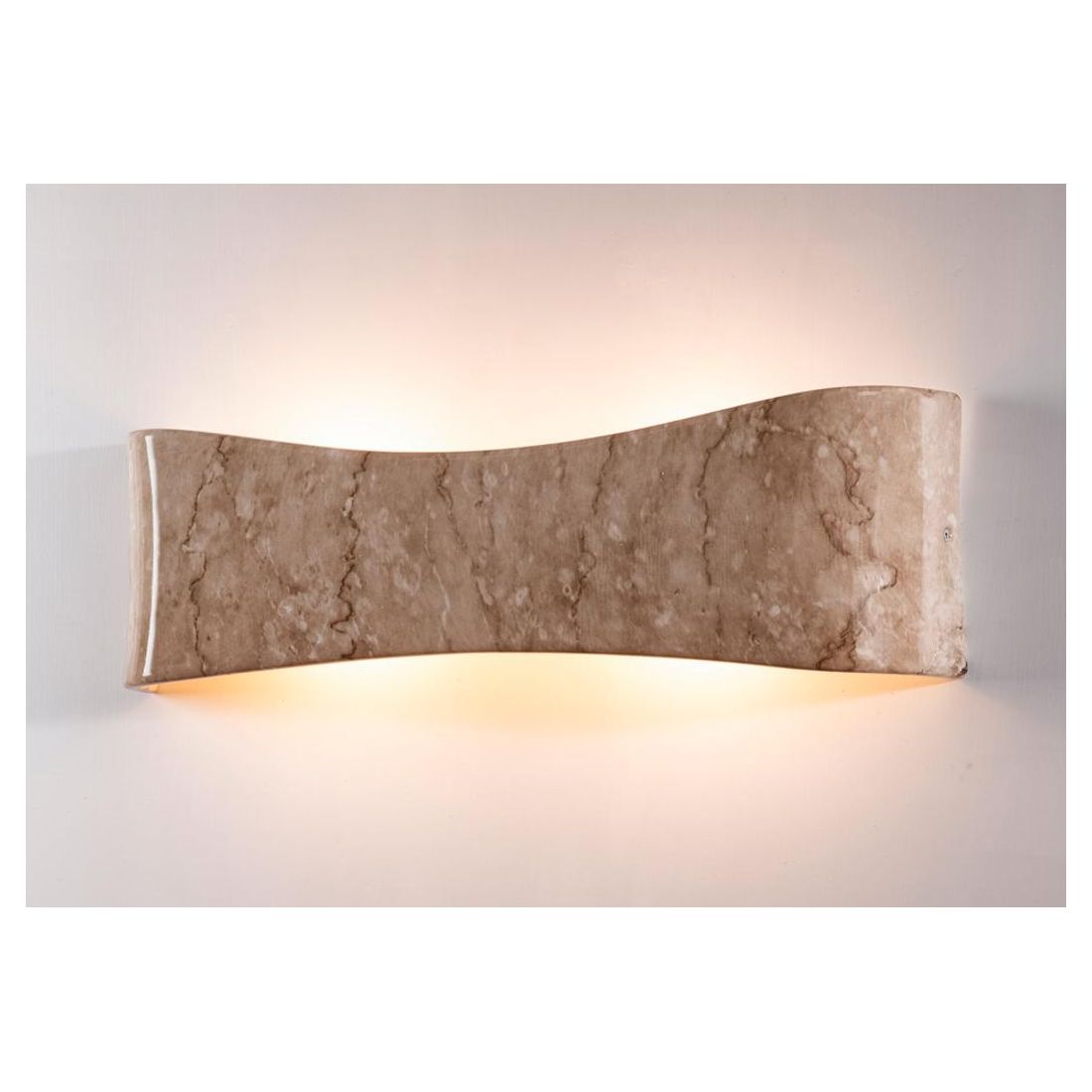 Lampada da parete a fascia, dalla forma particolare, realizzata a mano in Italia dal produttore IMAS, prodotta in ceramica con una finitura in marmo travertino, con fessura anche sul basso che crea scenici fasci di luce sopra e sotto per un'illuminazione indiretta sulla parete.