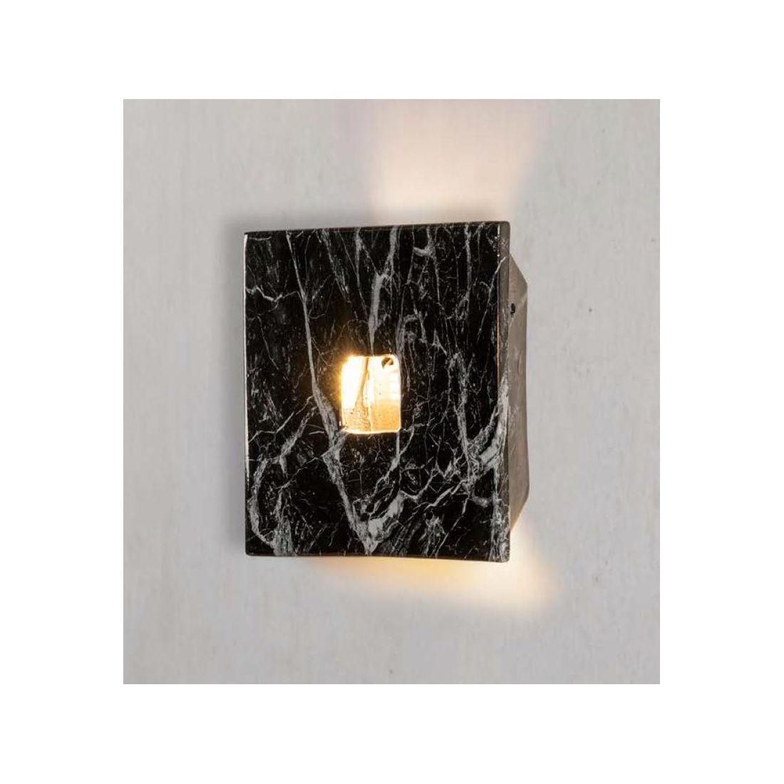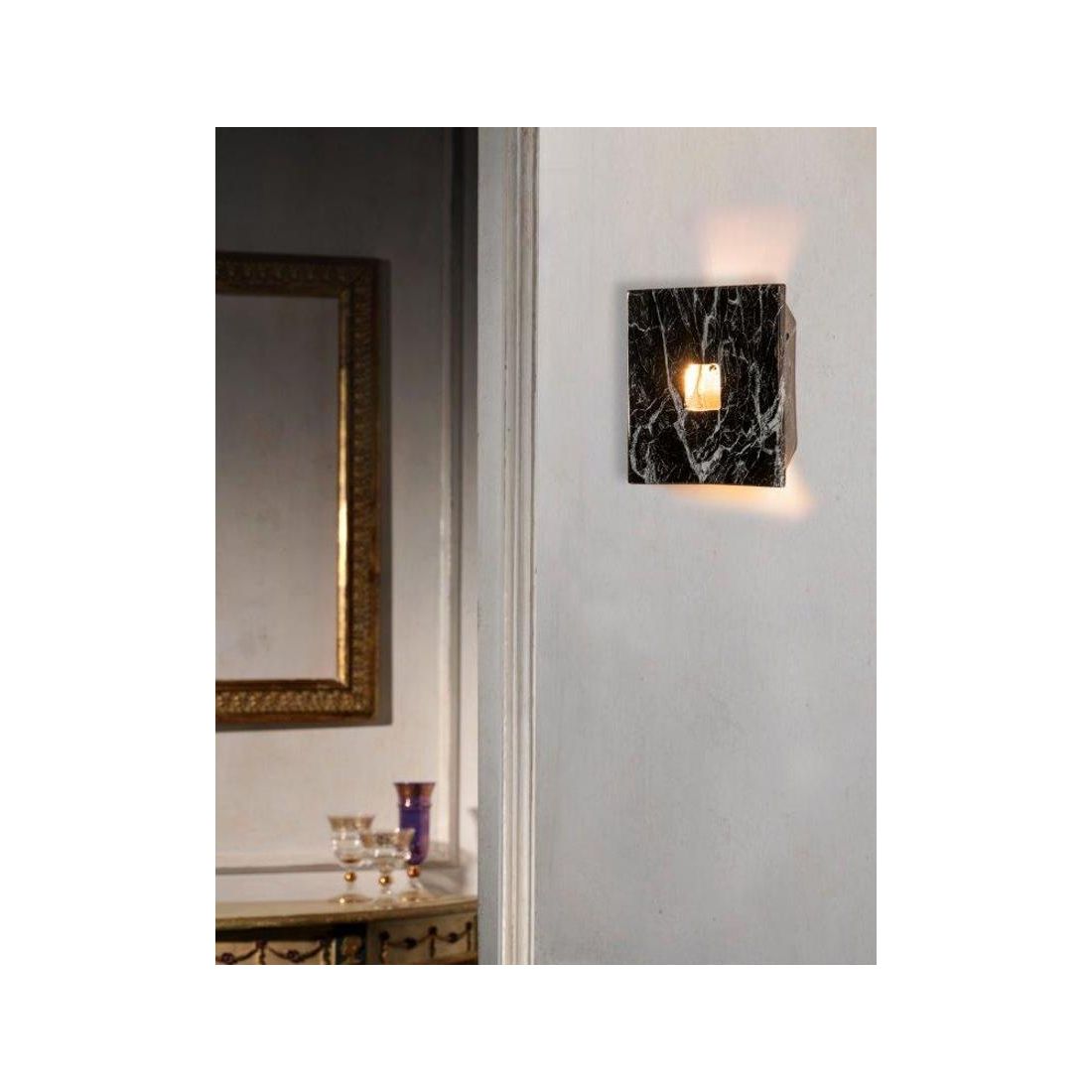Lampada da parete di forma quadrata, cm 23x23, realizzata a mano in Italia dal produttore IMAS, prodotta in ceramica con una finitura in marmo Nero, con piccola fessura al centro della struttura, perfetta per l'illuminazione di ingressi, corridoi, scale, salotti, studi e taverne ma comunque per qualsiasi ambiente con arredamenti sia classici che rustici.