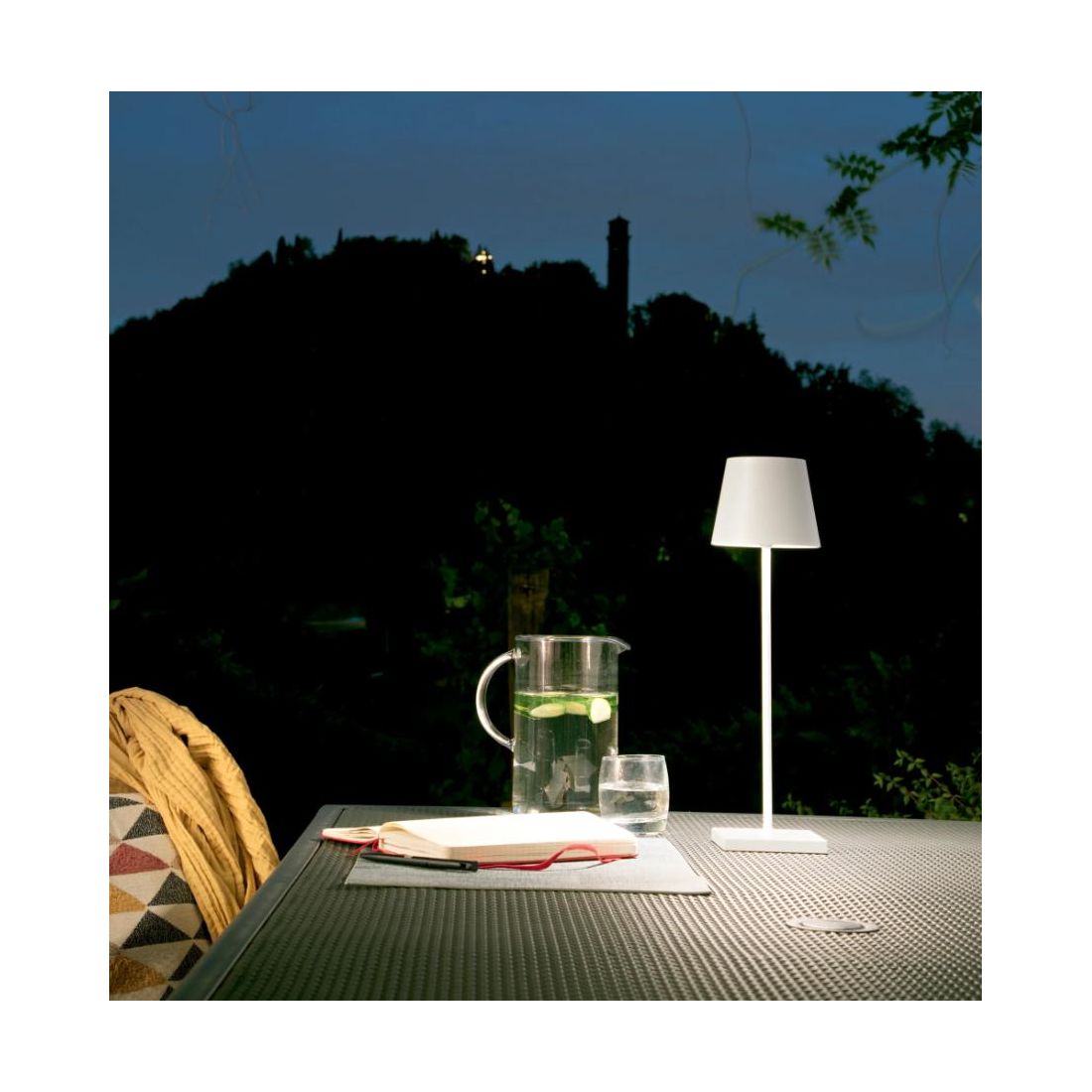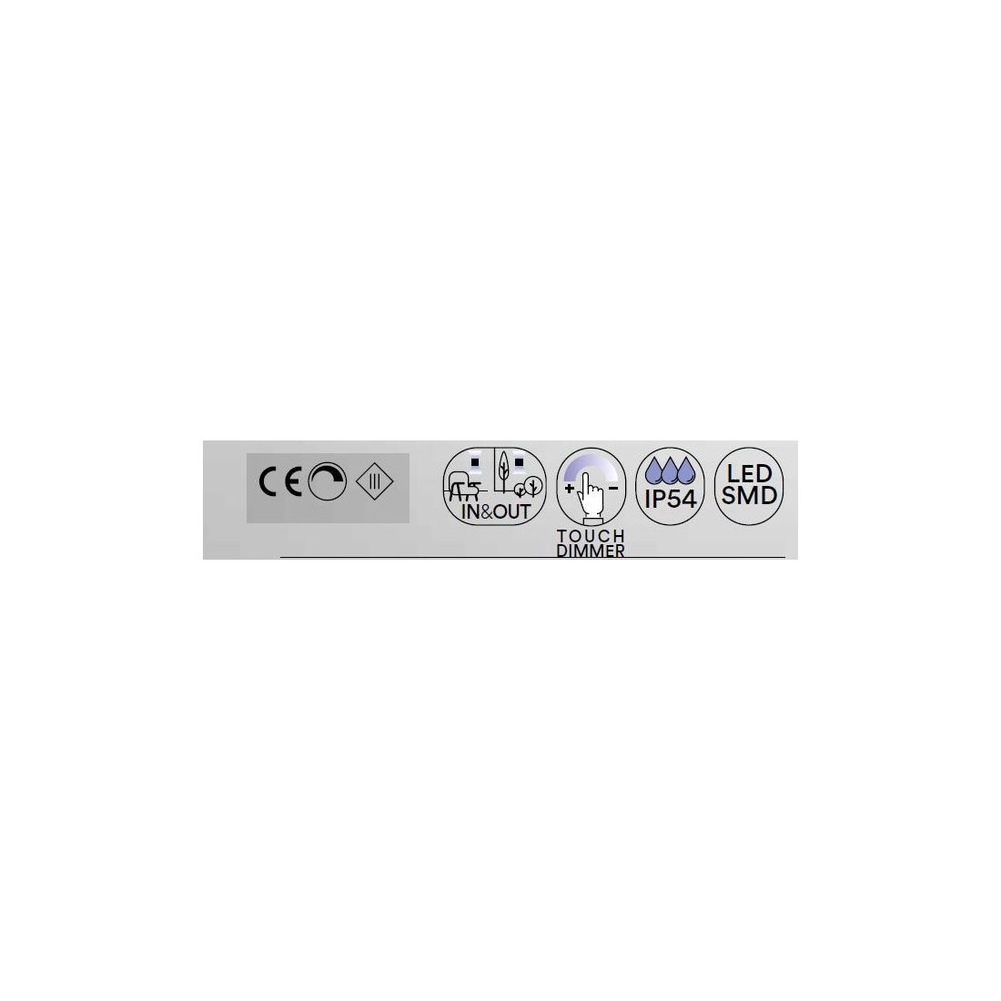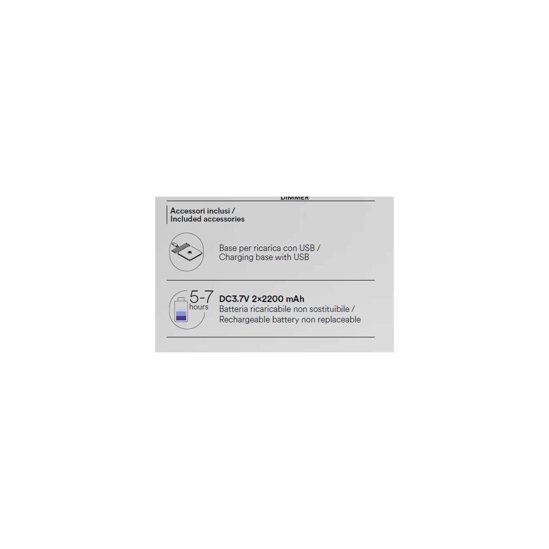 E' dotata di sorgente luminosa a Led da 2.2w con una resa luminosa di 190 lumen in luce bianca calda 3000k; sulla sua parte superiore è posto il pulsante Touch che consente di accendere e spegnere la lampada e anche di regolare l'intensità di luce. La batteria integrata garantisce un'autonomia di 5-7 ore e viene ricaricata in modo semplice mediante base con interruttore USB in dotazione.