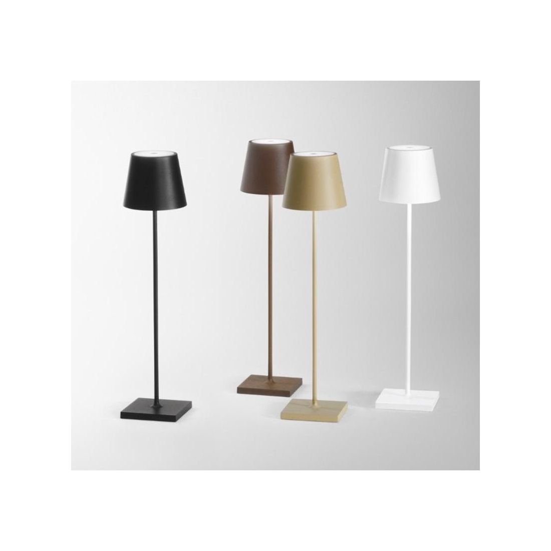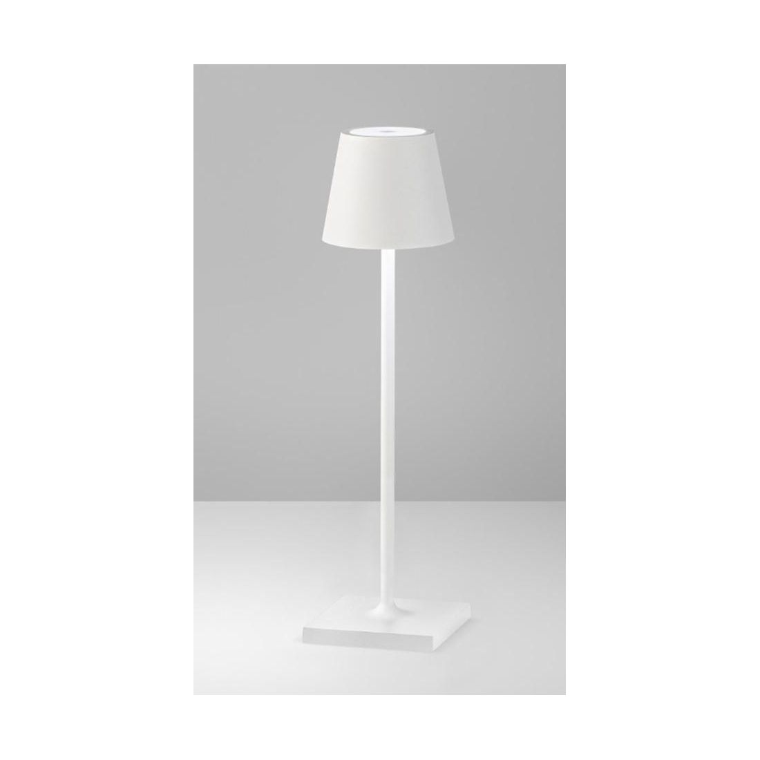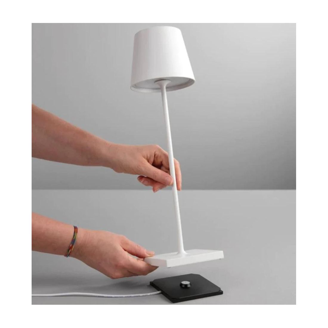 Lampada da tavolo in stile moderno, innovativa, che si può facilmente trasportare ovunque grazie alle sue dimensioni ridotte e alla possibilità di utilizzarla senza fili; viene realizzata in metallo con 4 finiture a scelta tra il Corten, il Bianco, il Nero oppure l'Oro.